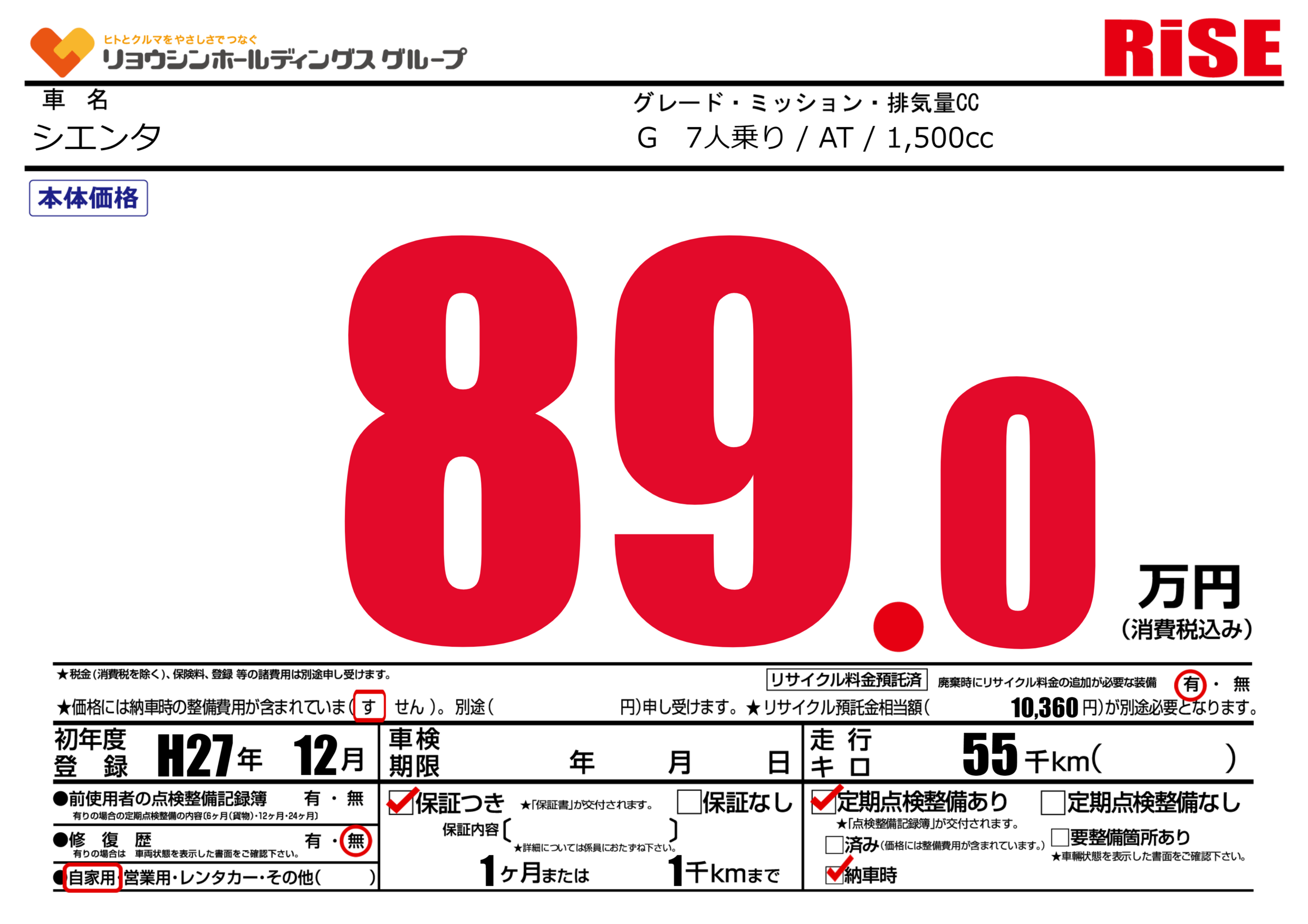 | 車名 | シエンタ | グレード ミッション 排気量 |