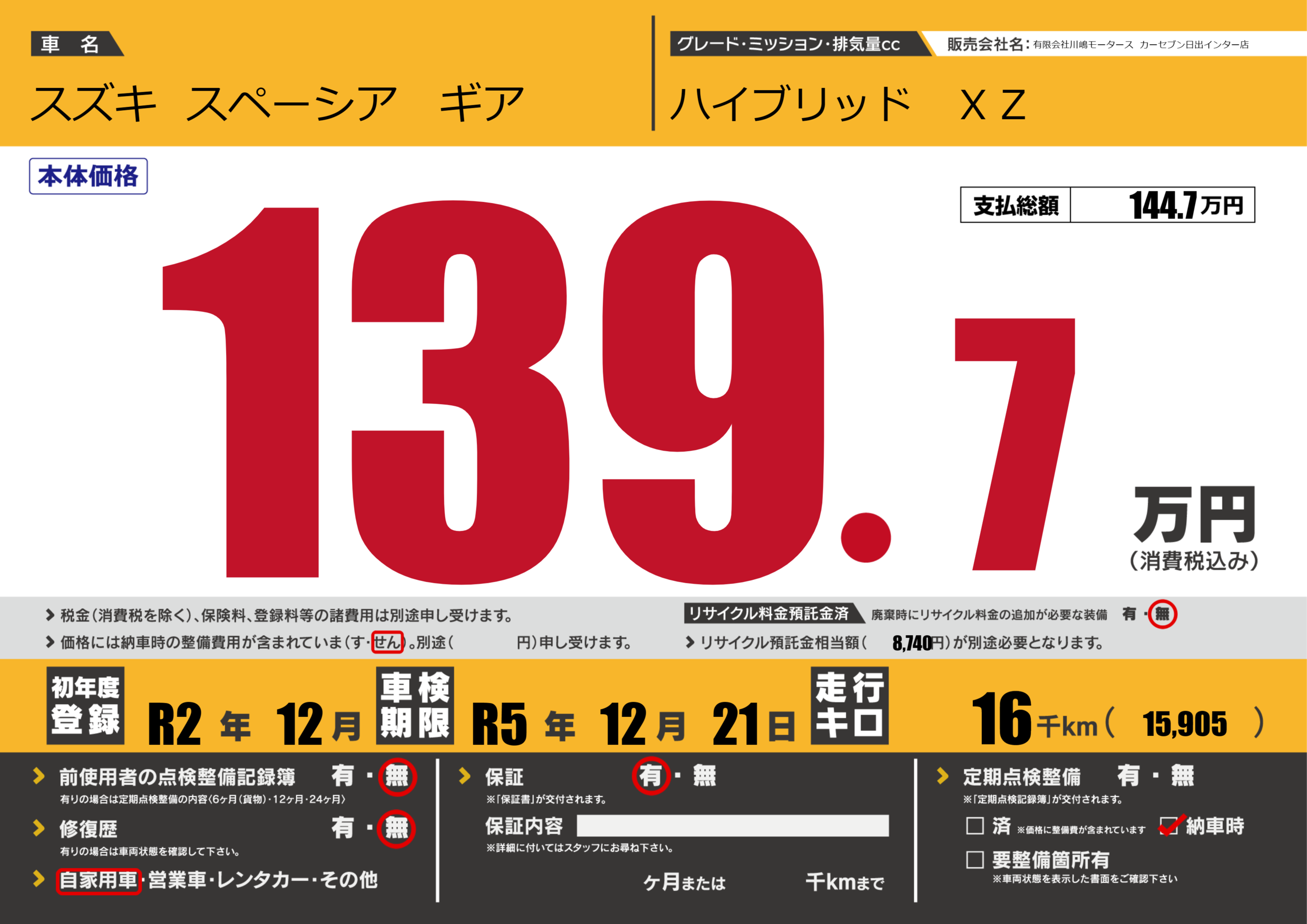 | 走行キロ | 1.6万km | 初年度登録 | R2年12月 |
