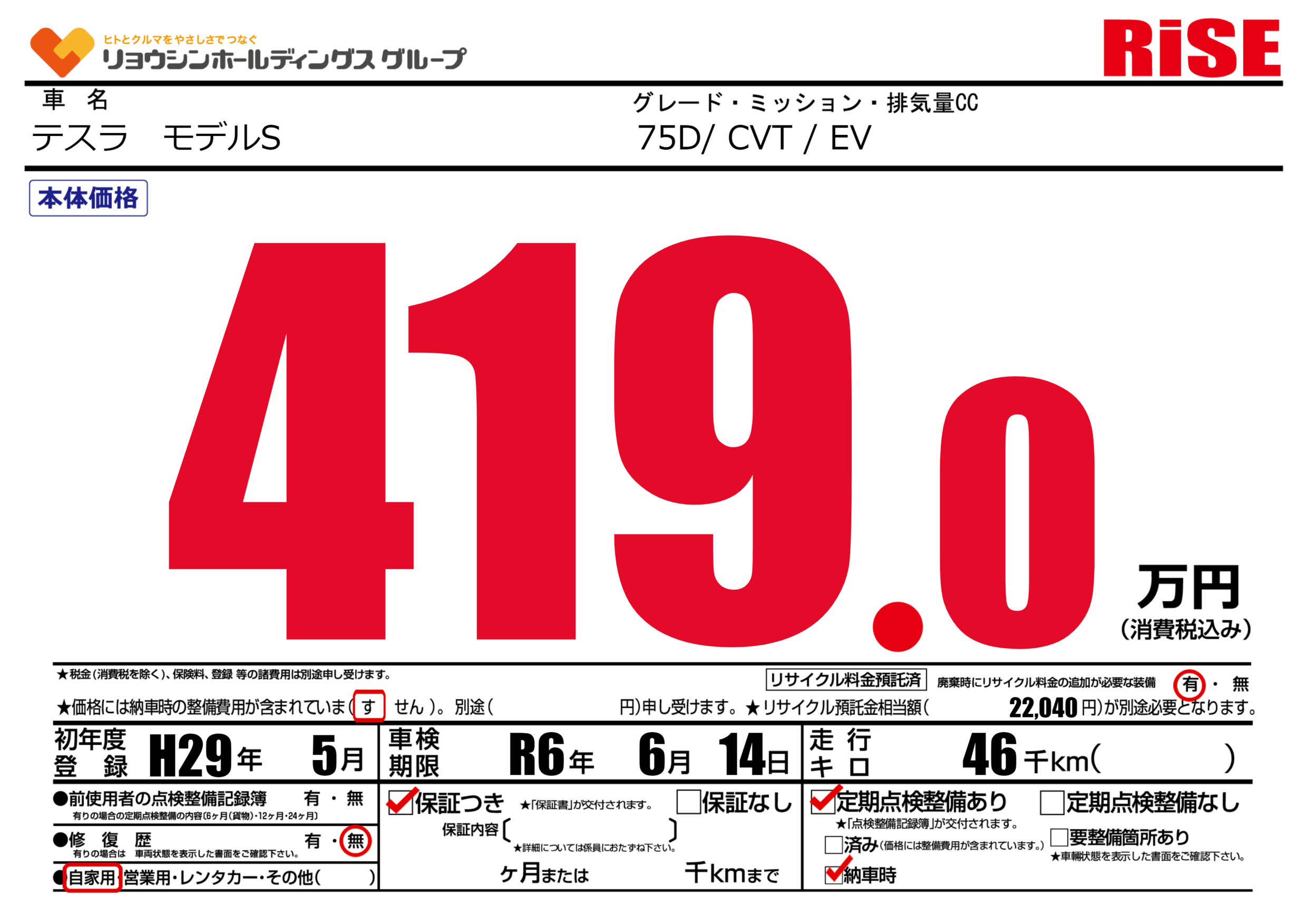 | 車名 | テスラ モデルS | グレード ミッション 排気量 |
