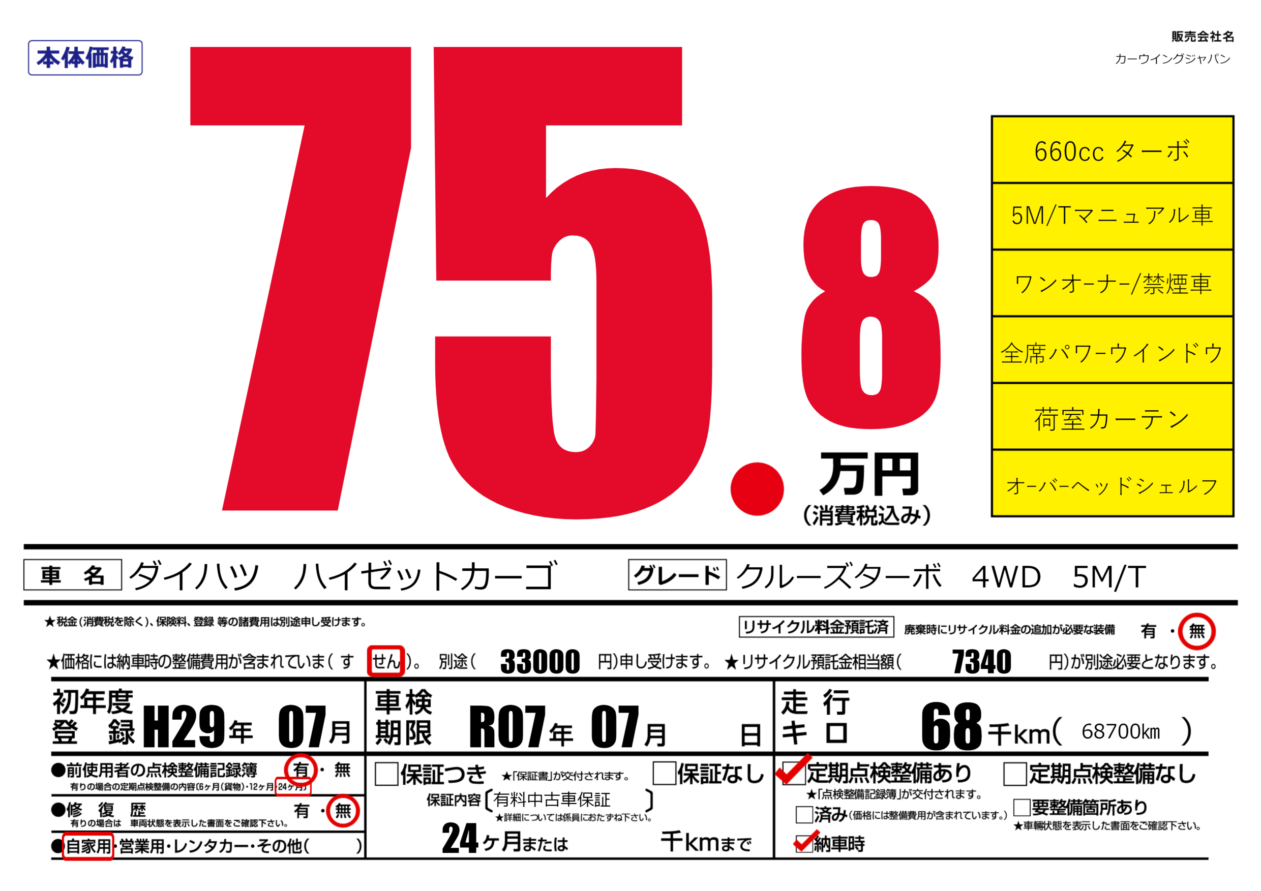 | 定期点検整備 | 定期点検整備あり 納車時あり | ||