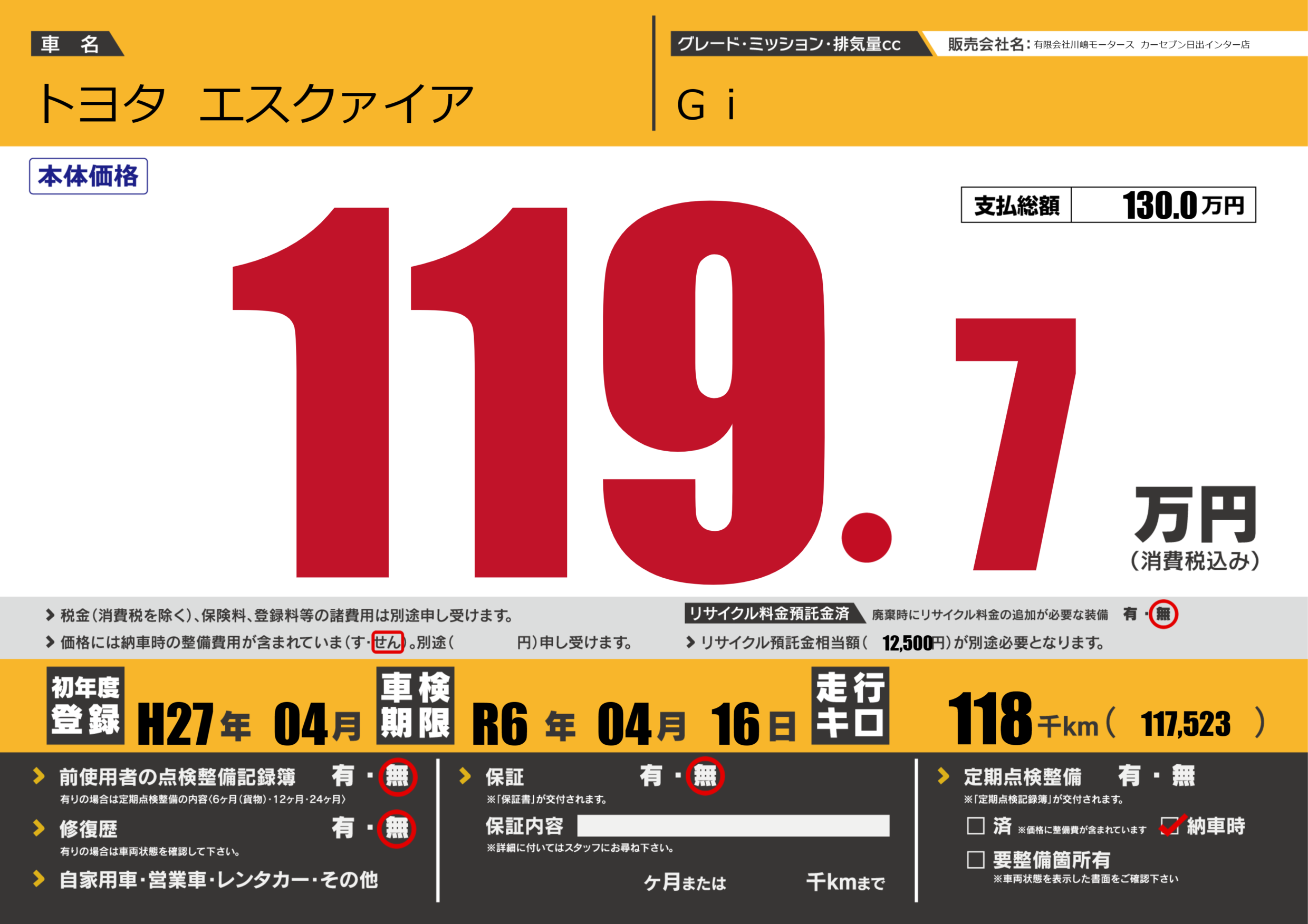 | 車名 | トヨタ エスクァイア | グレード ミッション 排気量 |