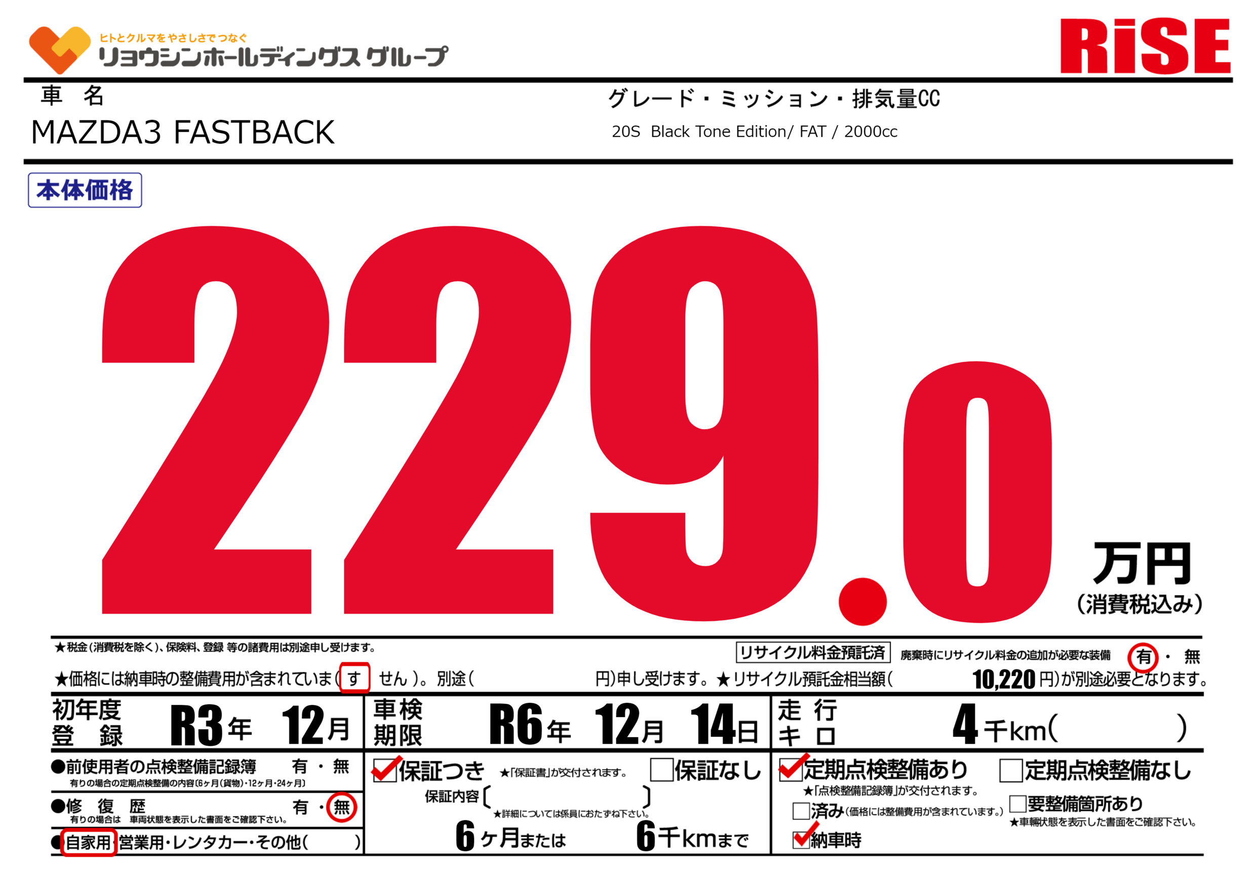 | 車名 | MAZDA3 FASTBACK | グレード ミッション 排気量 |