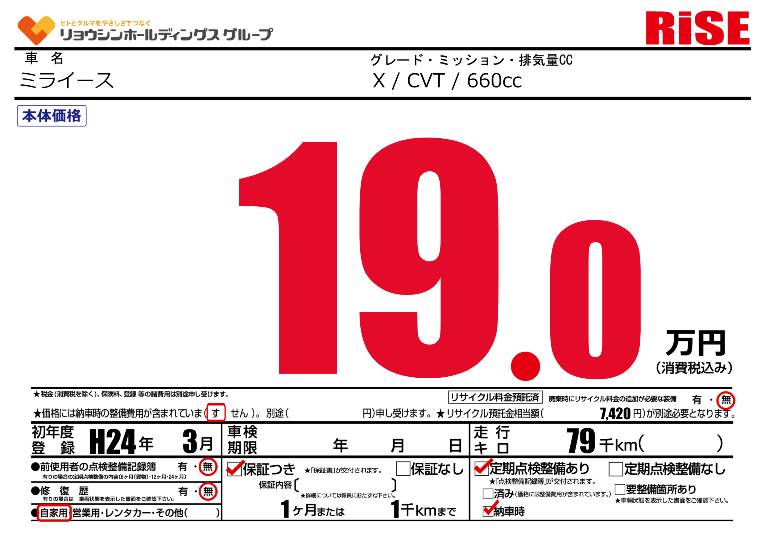 | 走行キロ | 7.9万km | 初年度登録 | H24年3月 |