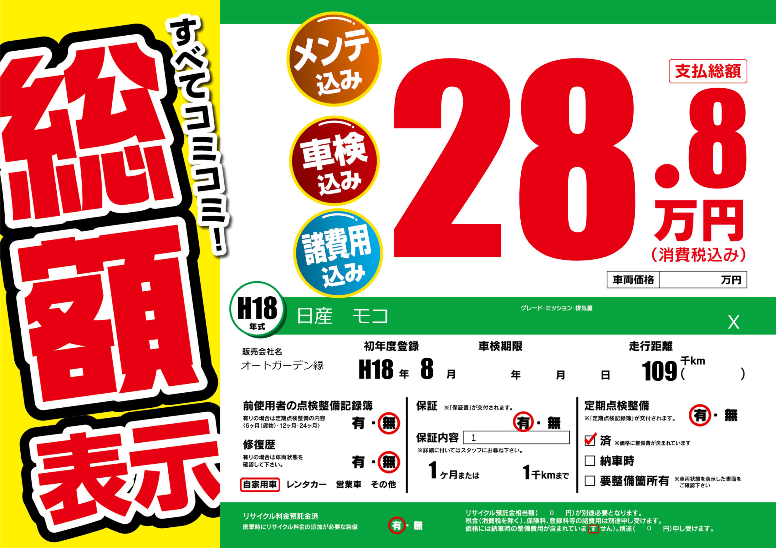 | 定期点検整備 | 定期点検整備あり 定期点検整備済み | ||