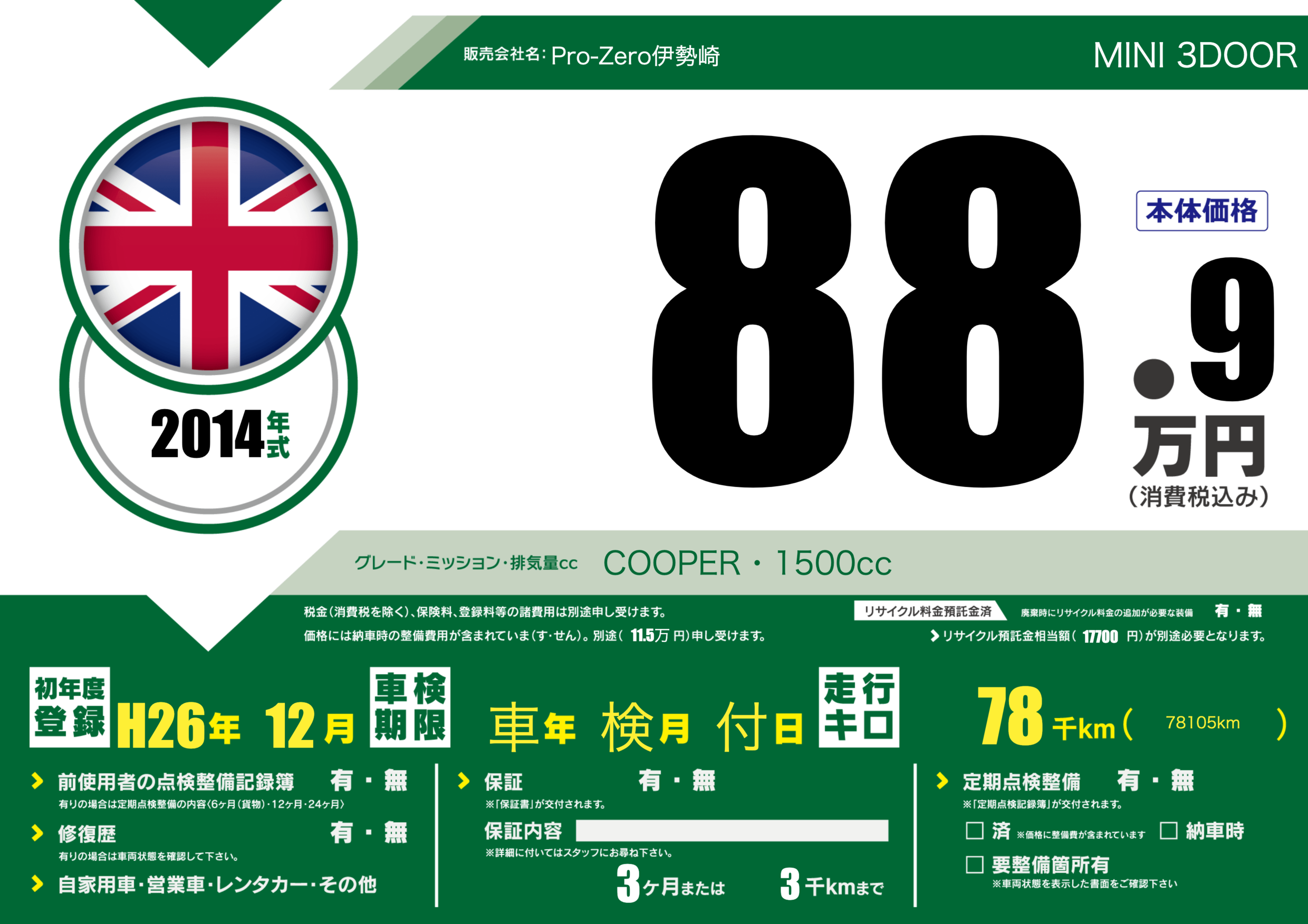 | 車名 | MINI 3DOOR | グレード ミッション 排気量 |
