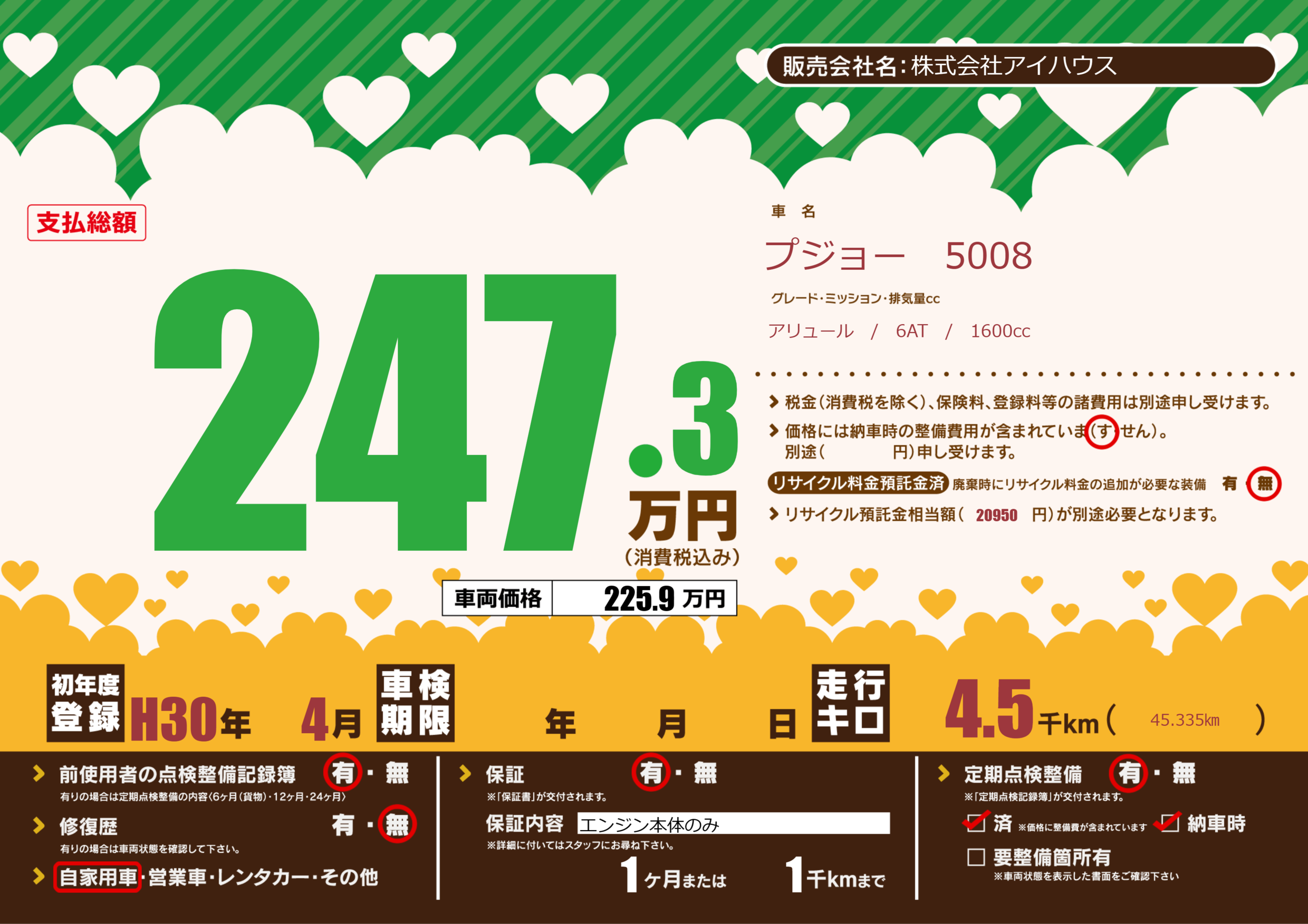 | 車名 | プジョー 5008 | グレード ミッション 排気量 |