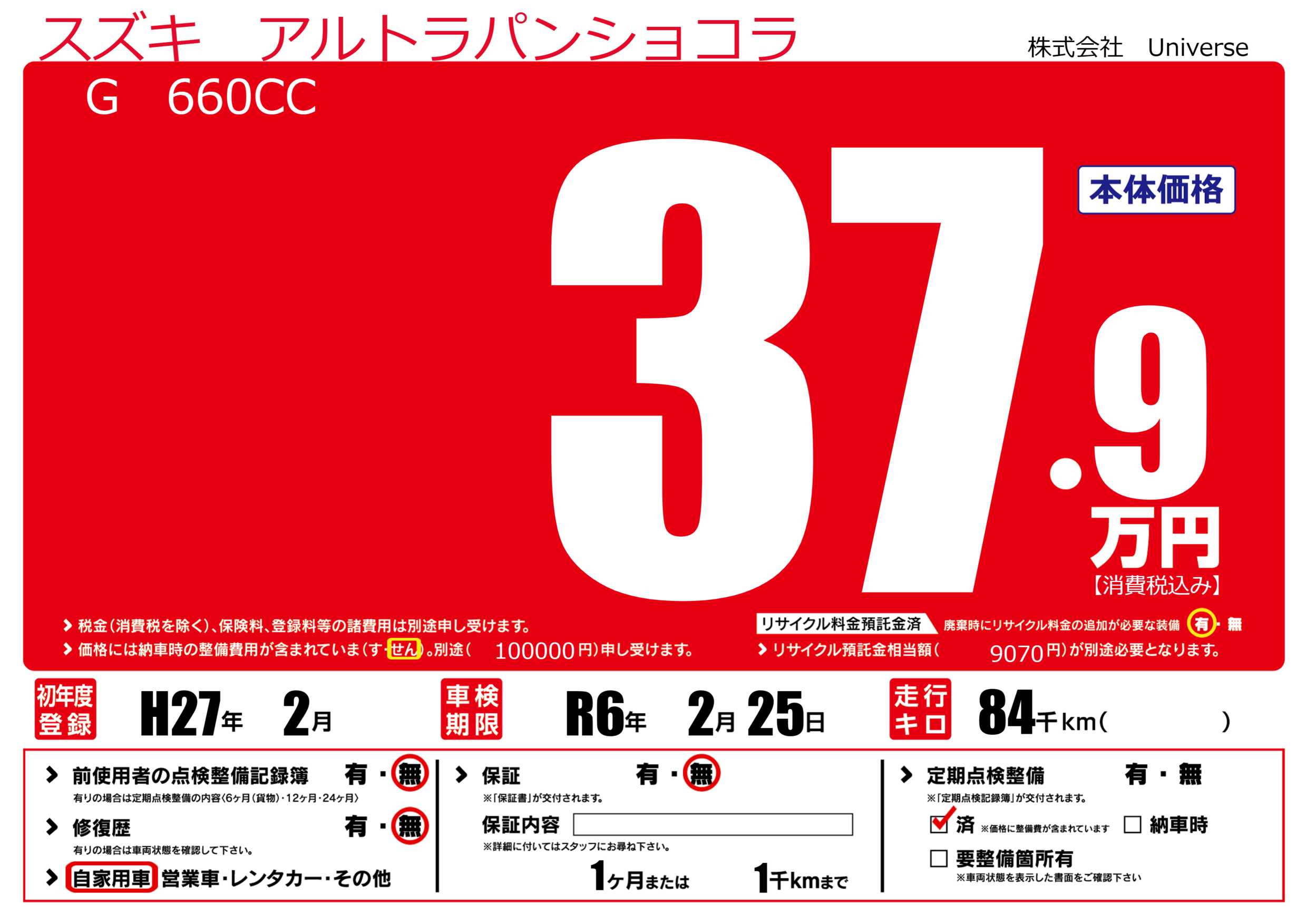 | 定期点検整備 | 定期点検整備済み | ||