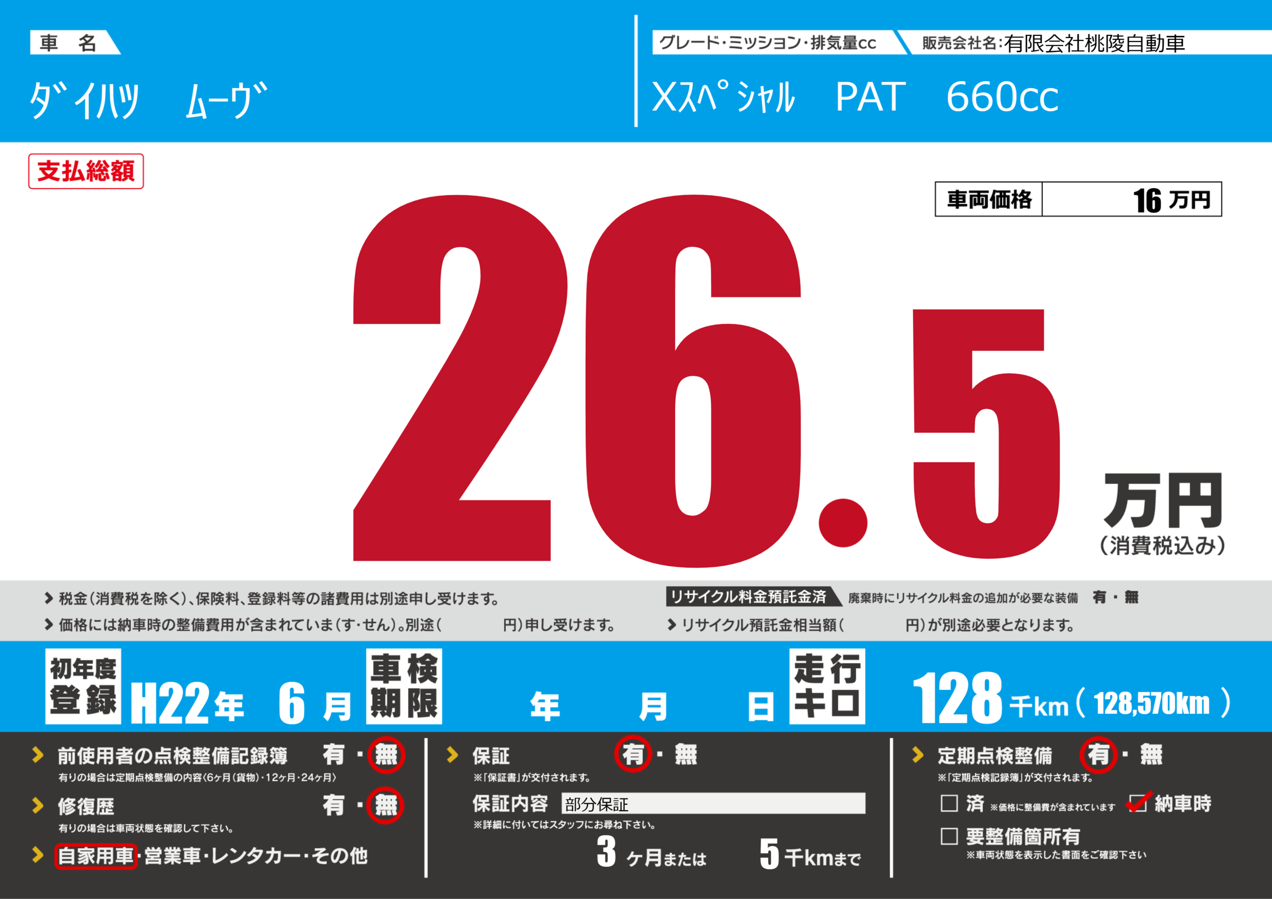 保証付き 保証内容(部分保証) 3ヶ月または(5)千kmまで |