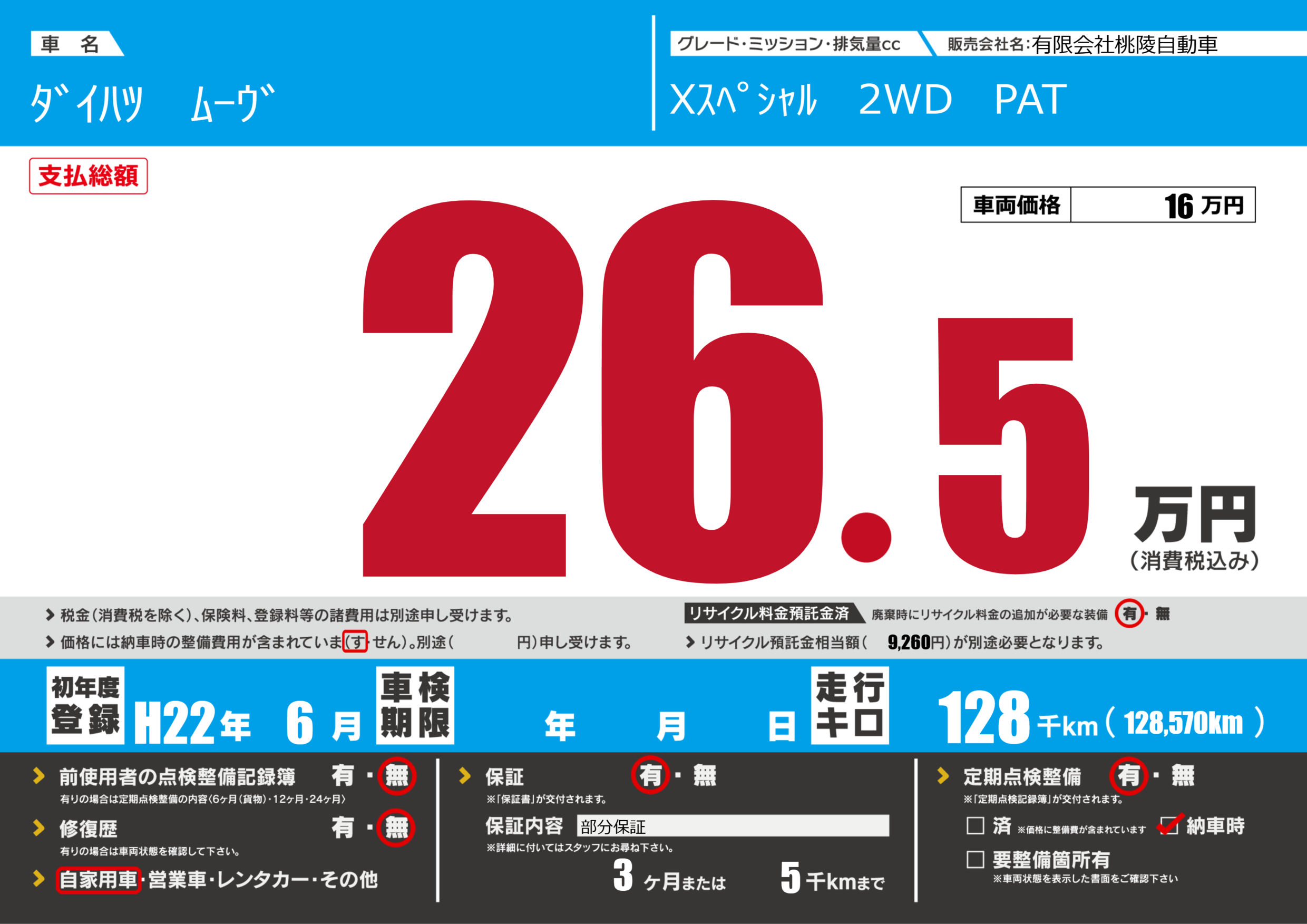 保証付き 保証内容(部分保証) 3ヶ月または(5)千kmまで |
