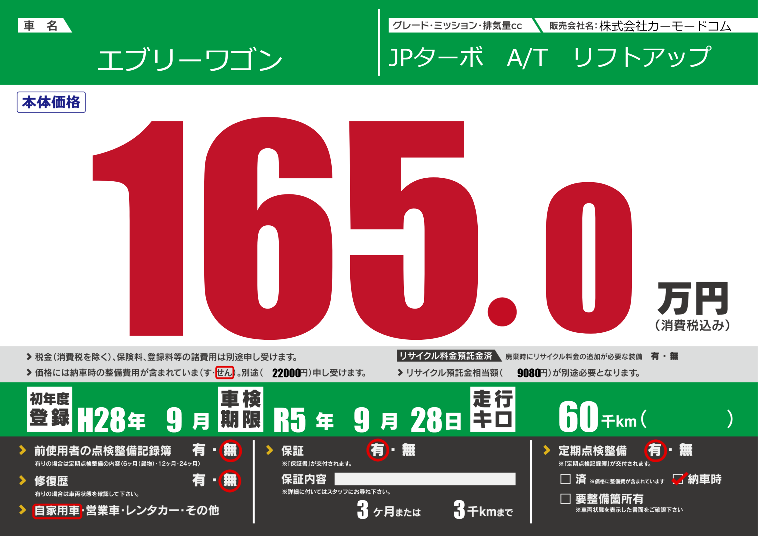 保証付き 保証内容(---) 3ヶ月または(3)千kmまで |
