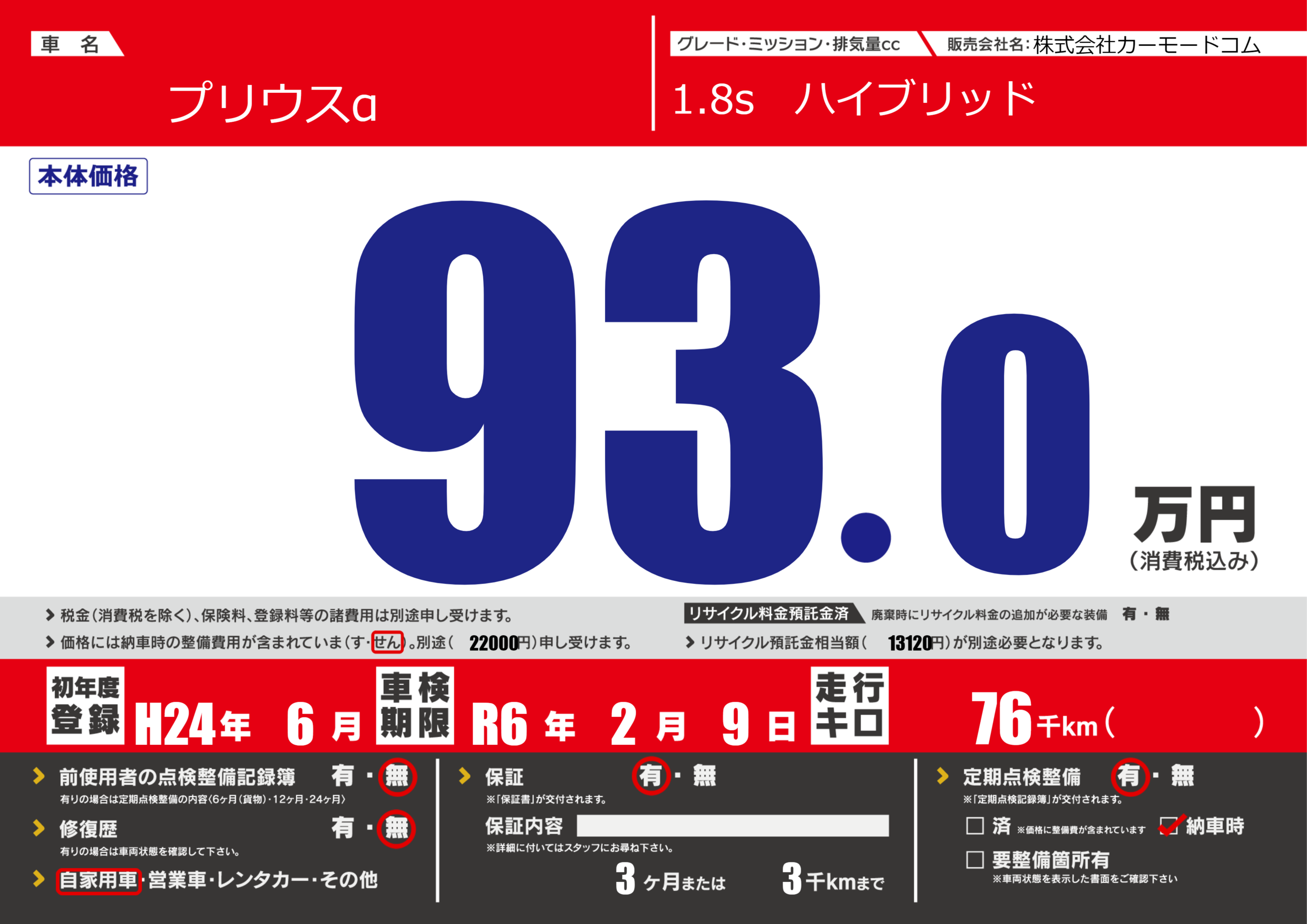 | 定期点検整備 | 定期点検整備あり 納車時あり | ||