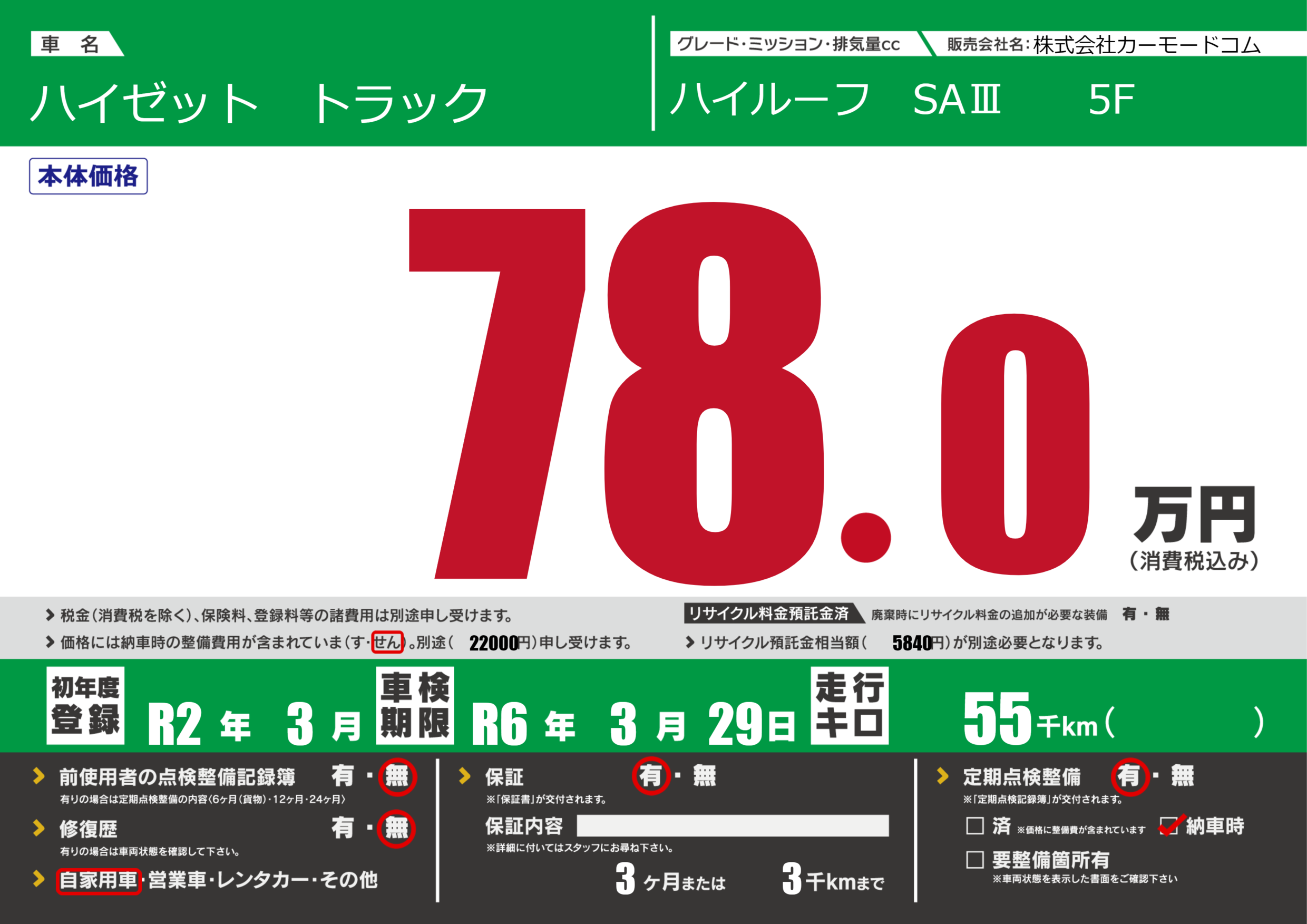 | 走行キロ | 5.5万km | 初年度登録 | R2年3月 |
