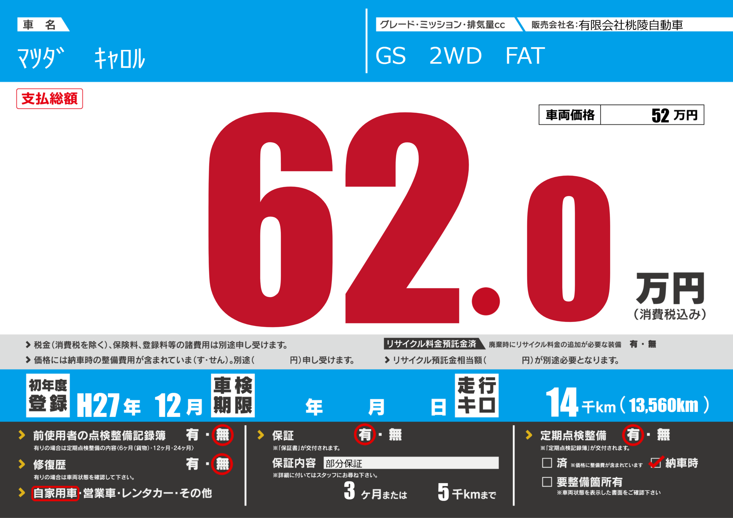 保証付き 保証内容(部分保証) 3ヶ月または(5)千kmまで |