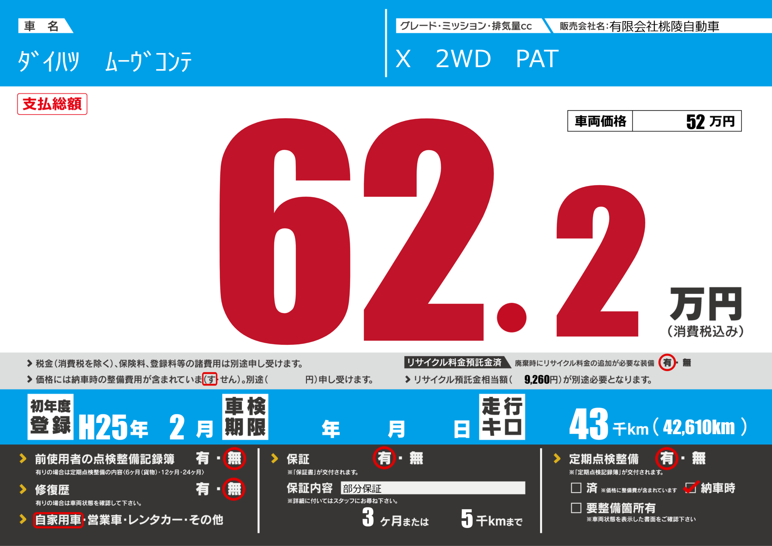 | 車名 | ダイハツ ムーヴコンテ | グレード ミッション 排気量 |