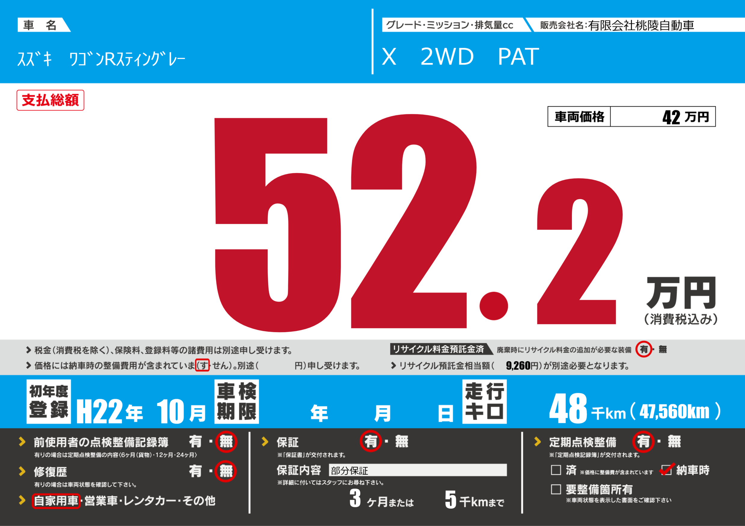 | 走行キロ | 4.8万km | 初年度登録 | H22年10月 |