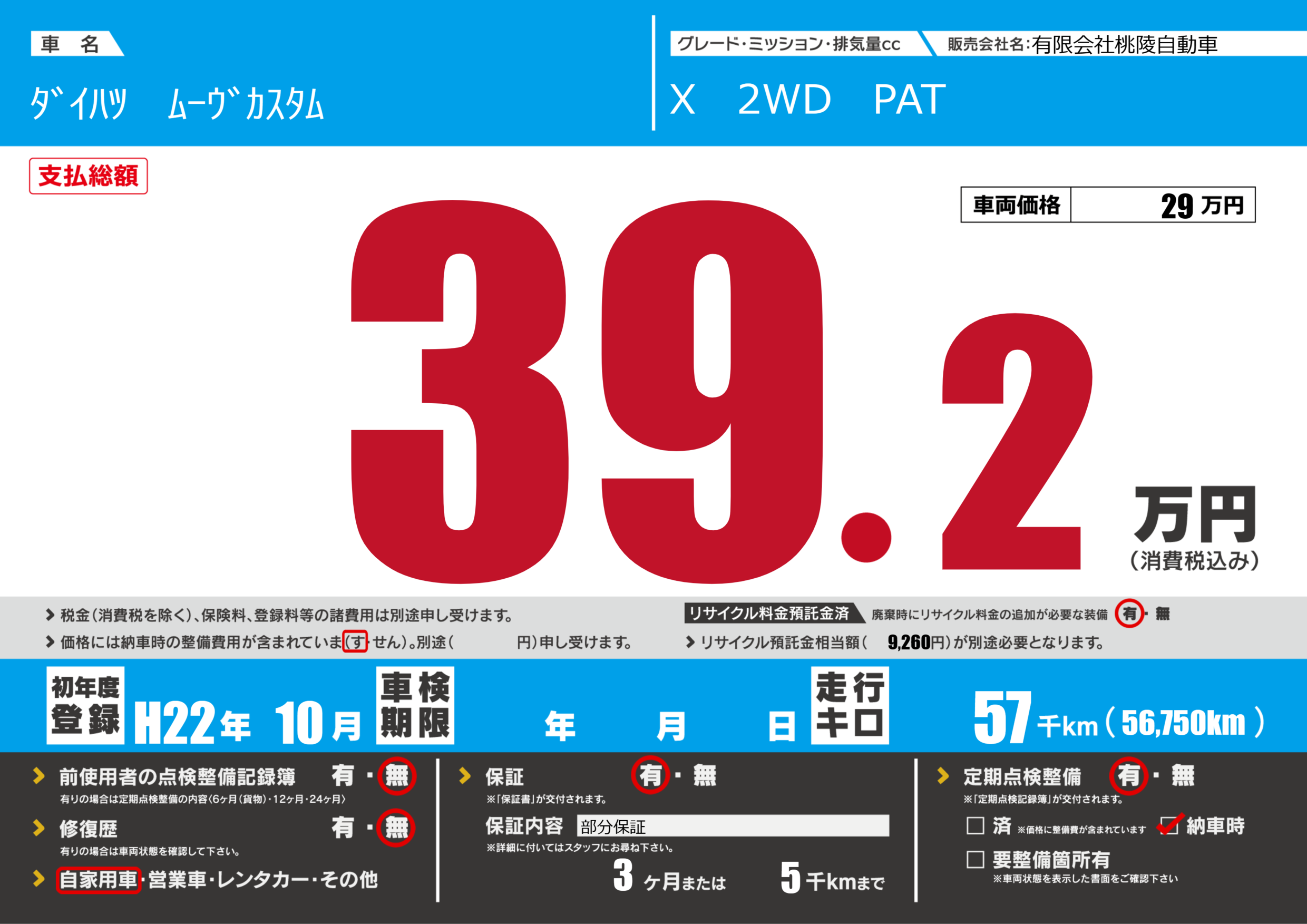 | 車名 | ダイハツ ムーヴカスタム | グレード ミッション 排気量 |