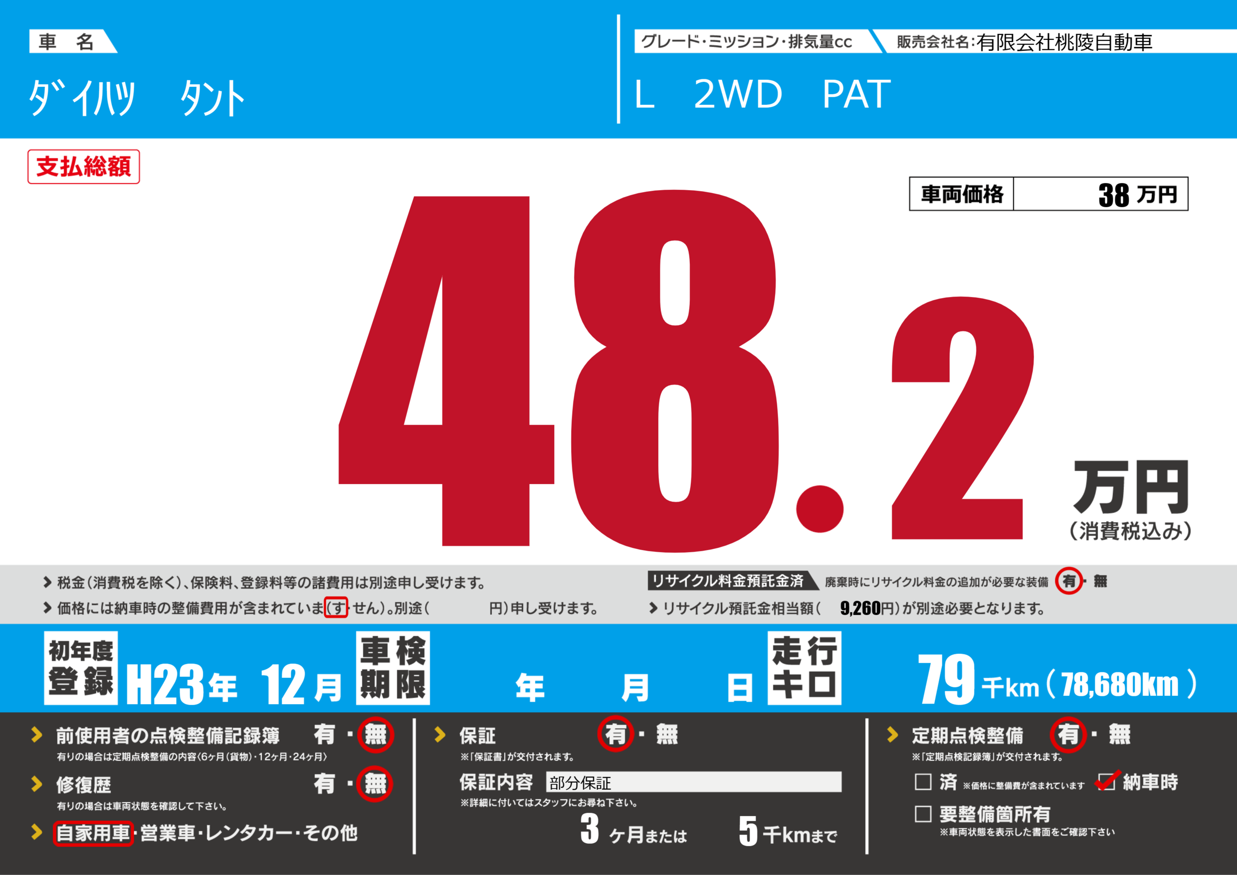| 車名 | ダイハツ タント | グレード ミッション 排気量 |