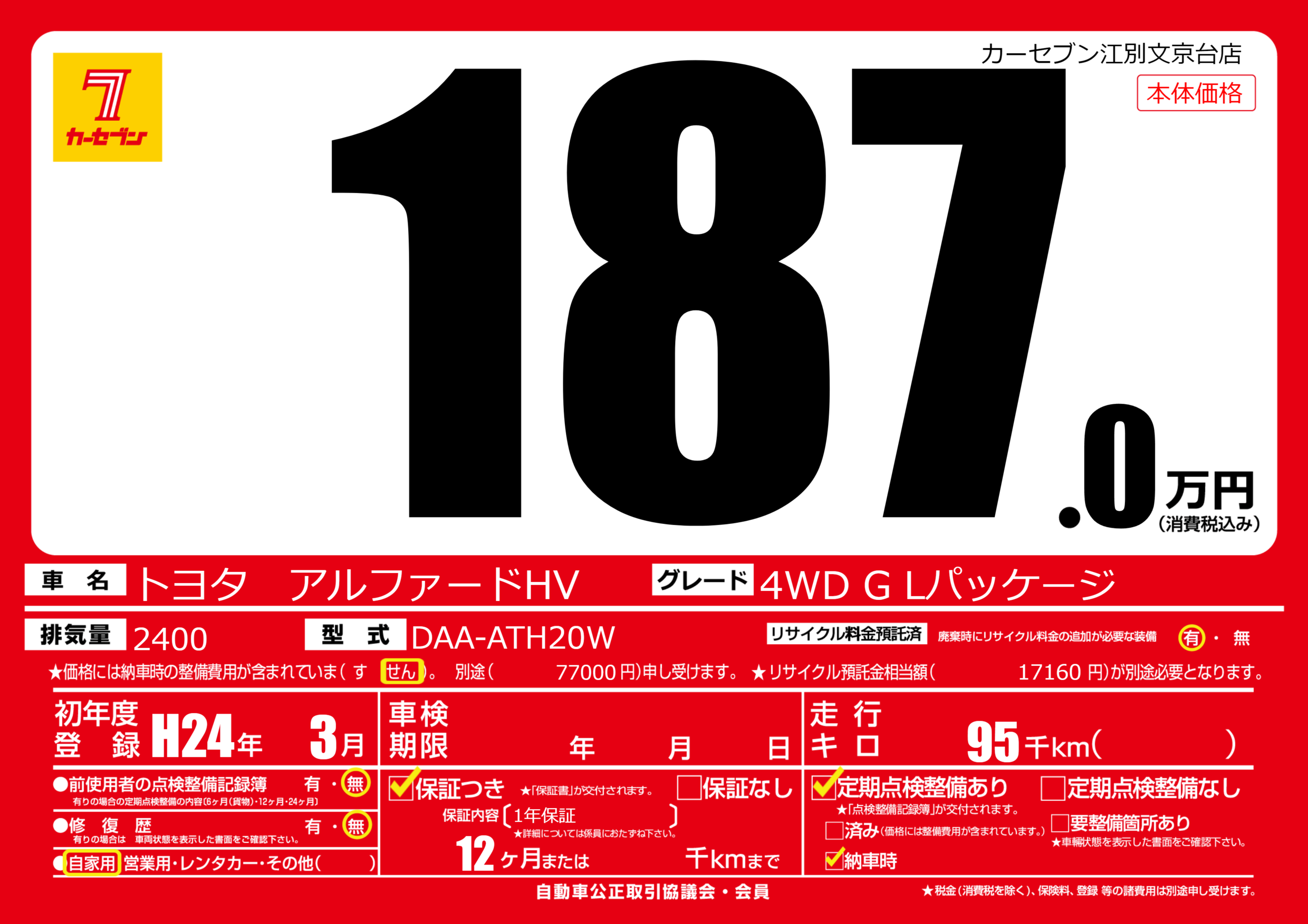| 車名 | トヨタ アルファードHV | グレード ミッション 排気量 |