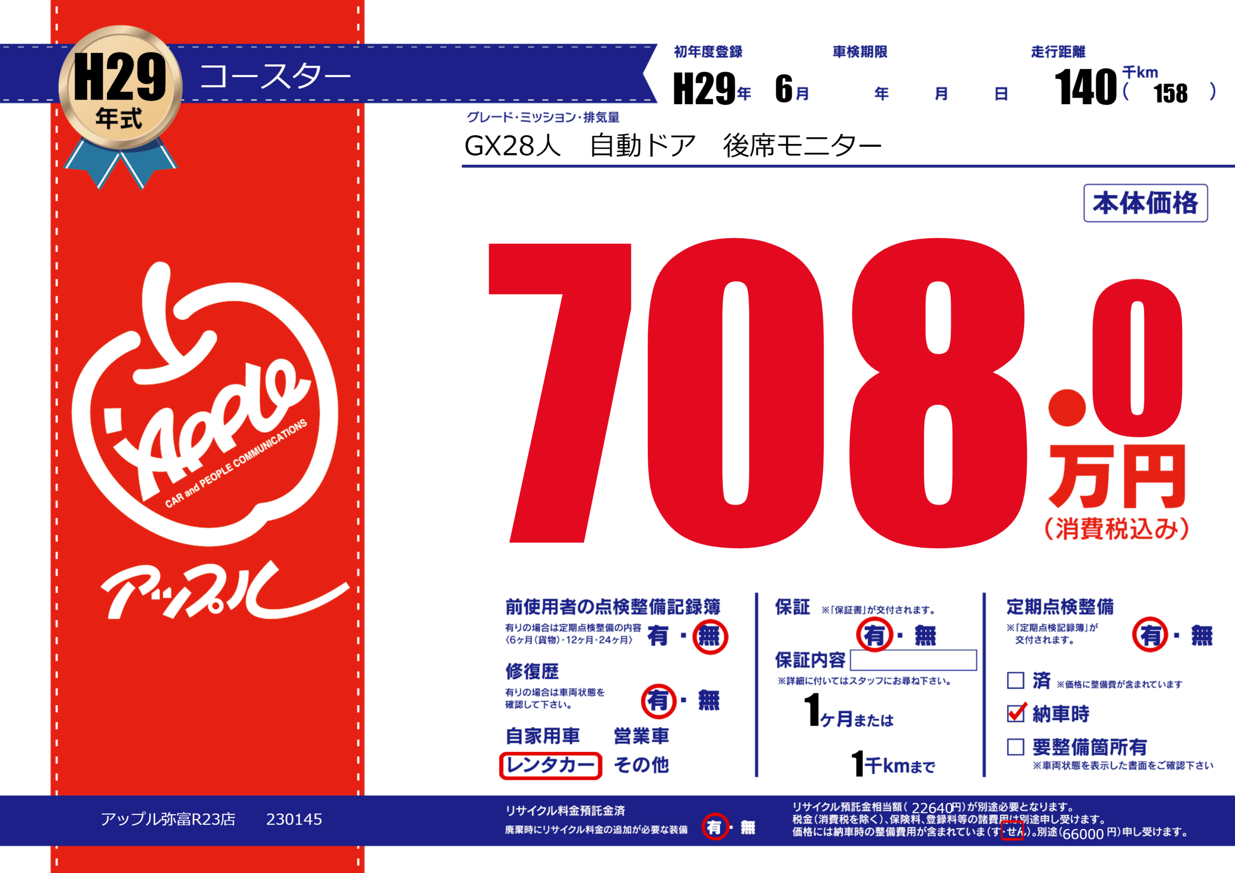| 走行キロ | 14万km | 初年度登録 | H29年6月 |
