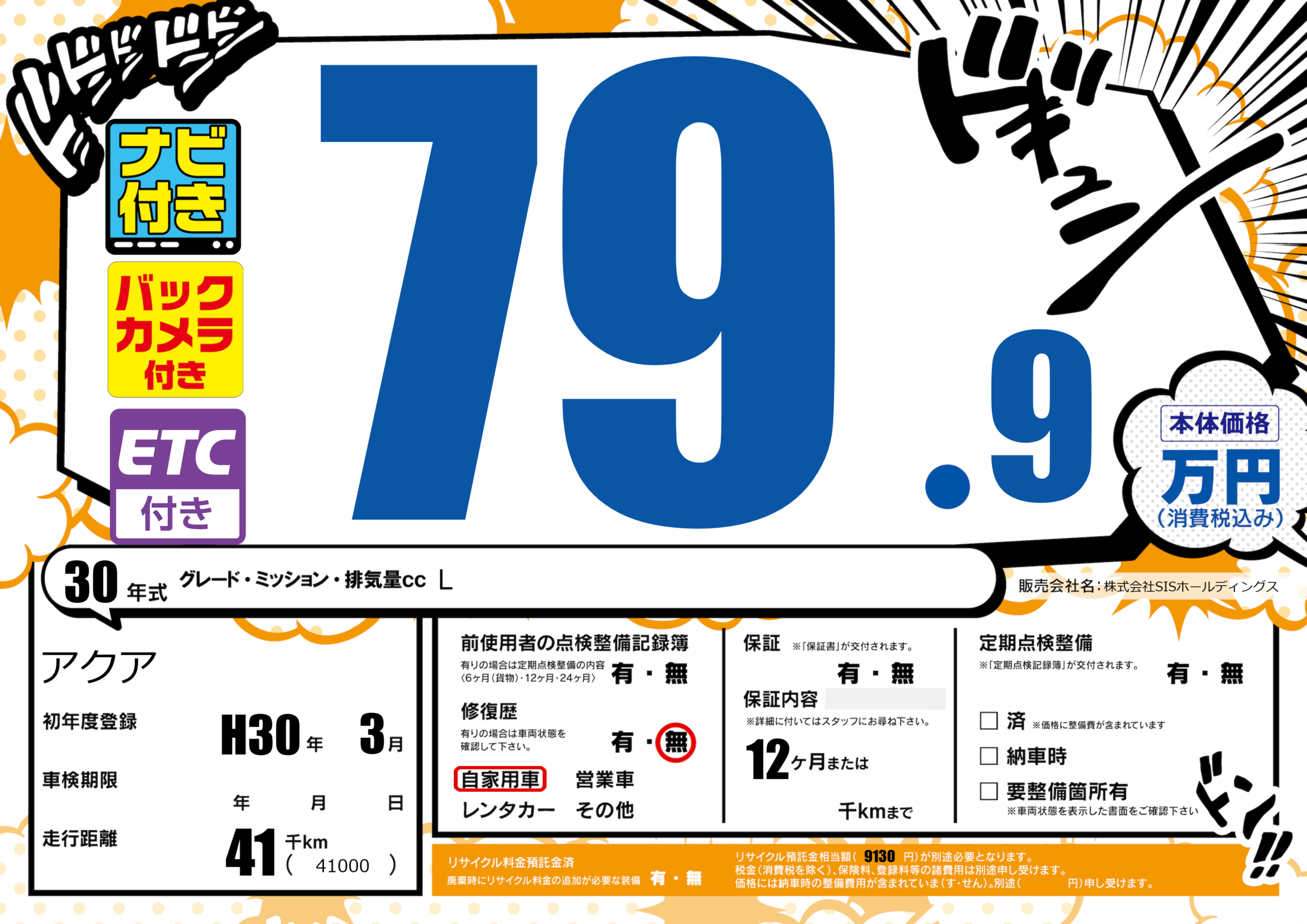 | 走行キロ | 4.1万km | 初年度登録 | H30年3月 |