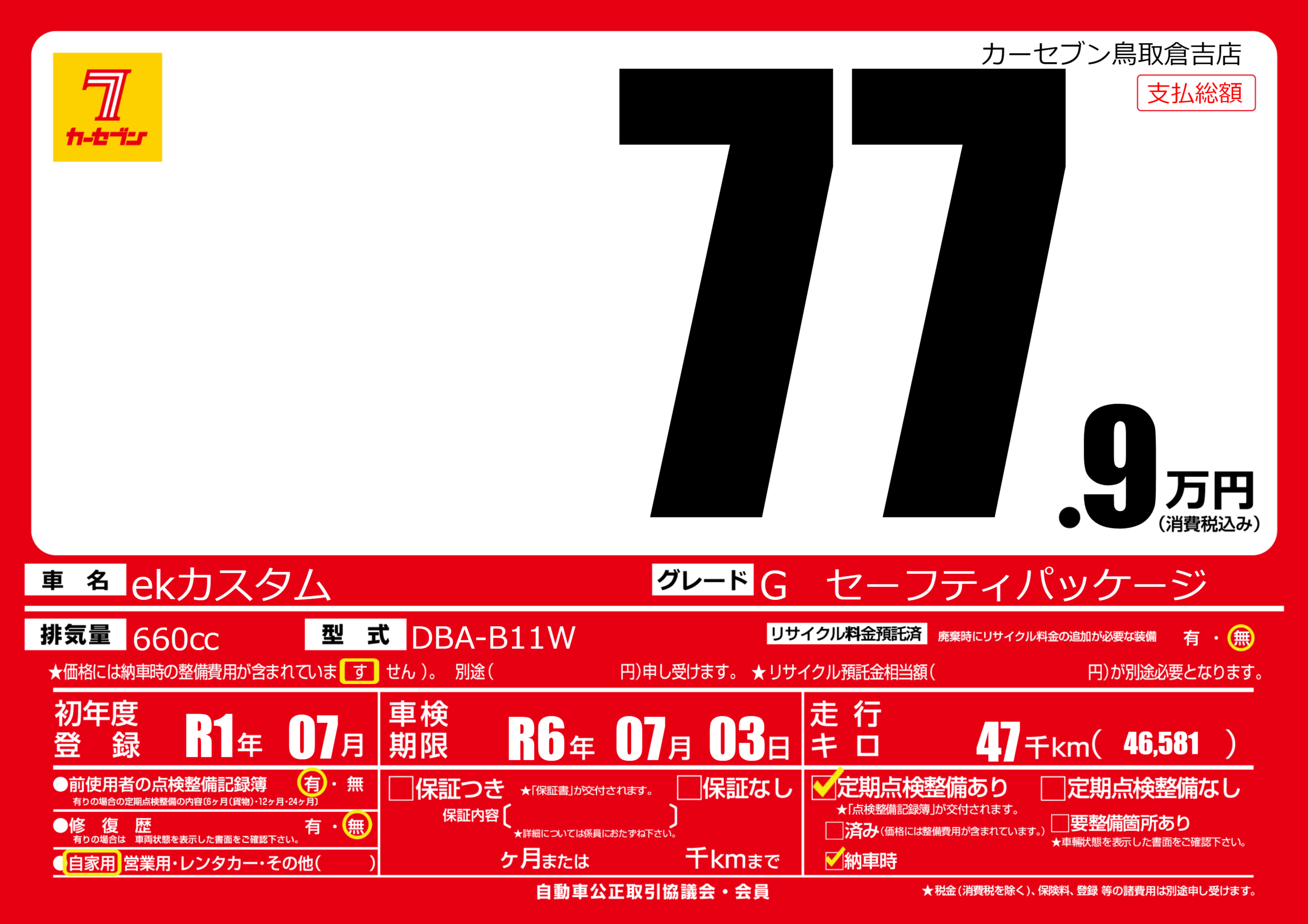| 定期点検整備 | 定期点検整備あり 納車時あり | ||