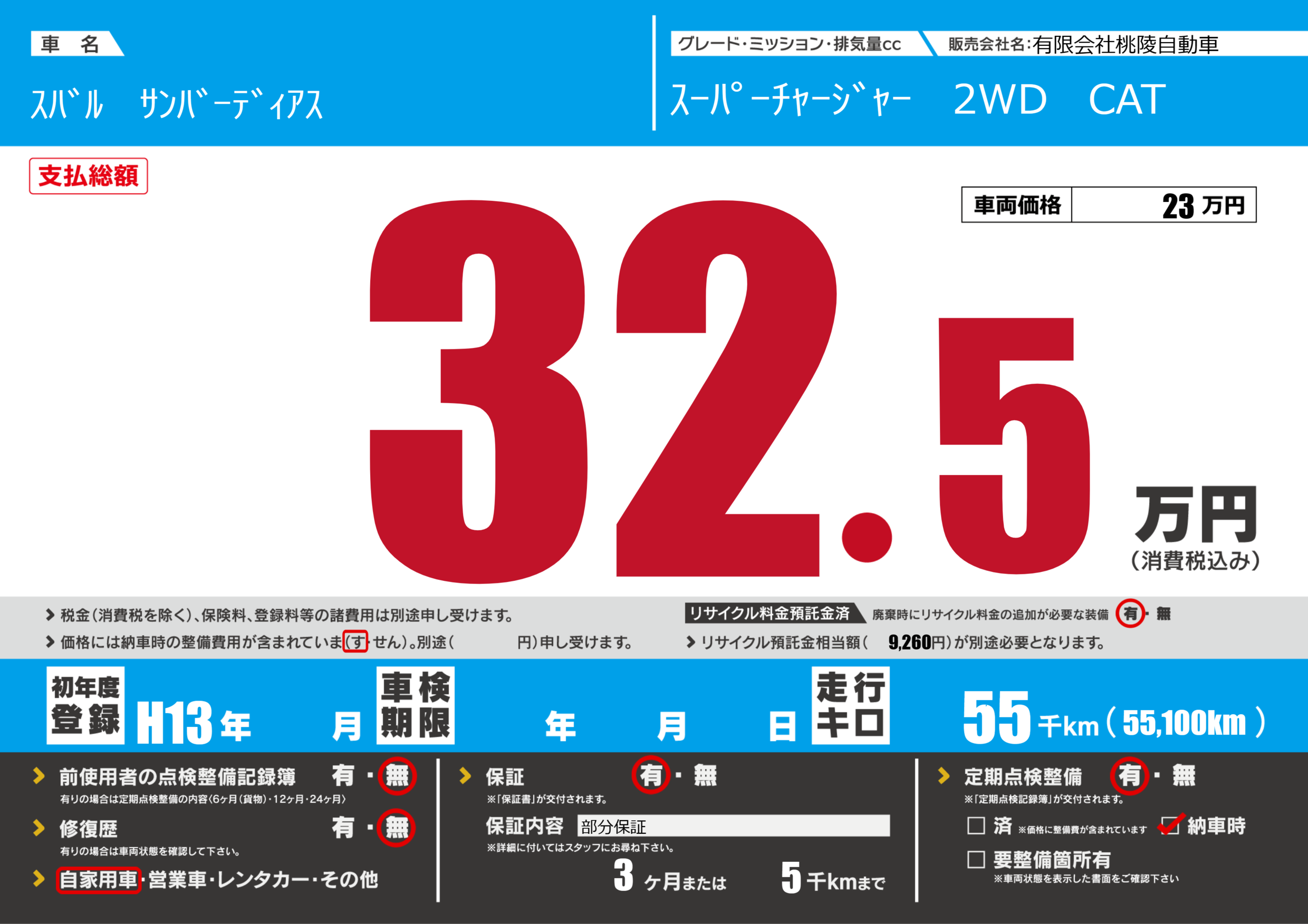 保証付き 保証内容(部分保証) 3ヶ月または(5)千kmまで |