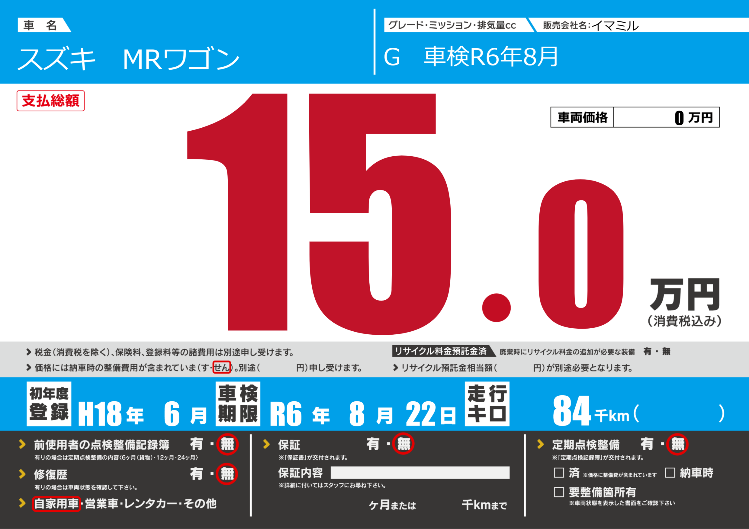 | 車名 | スズキ MRワゴン | グレード ミッション 排気量 |