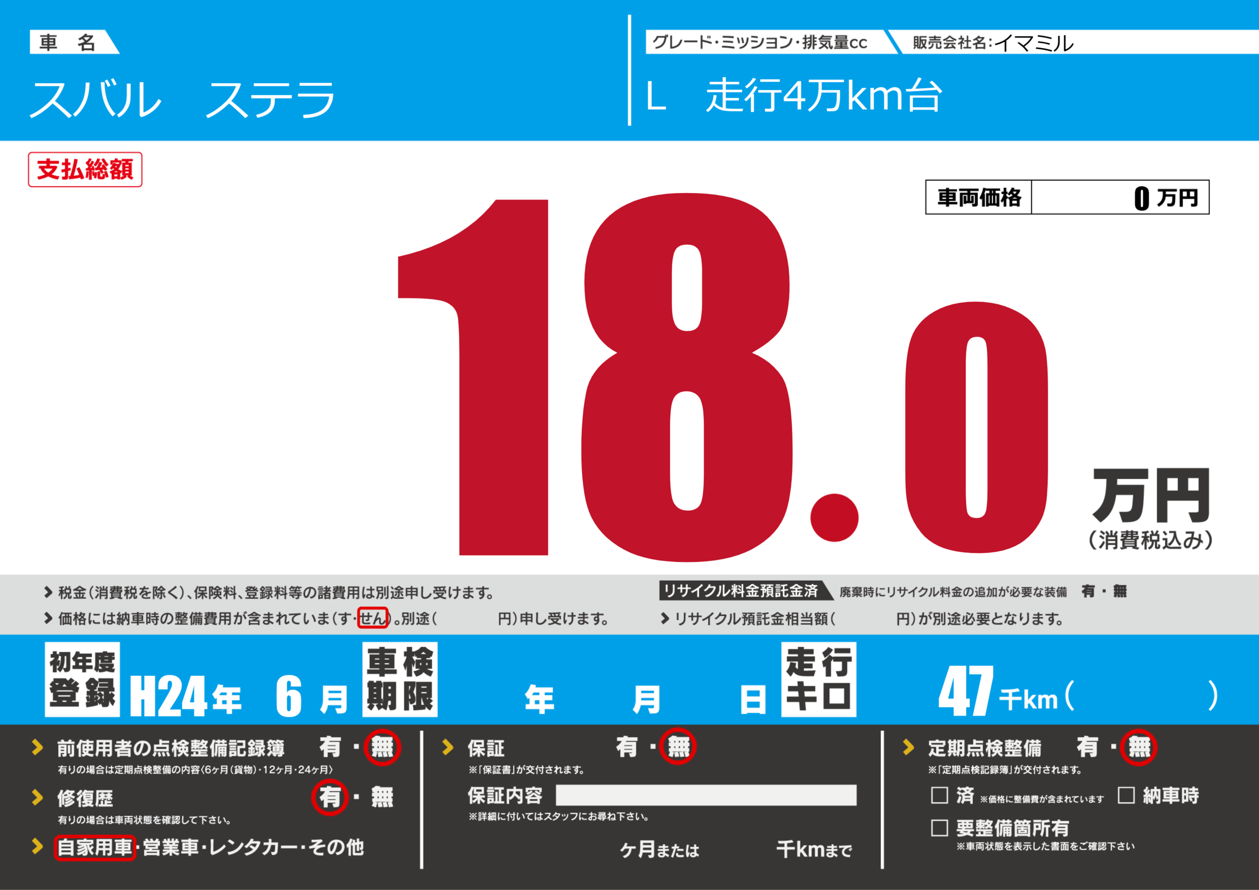 | 車名 | スバル ステラ | グレード ミッション 排気量 |