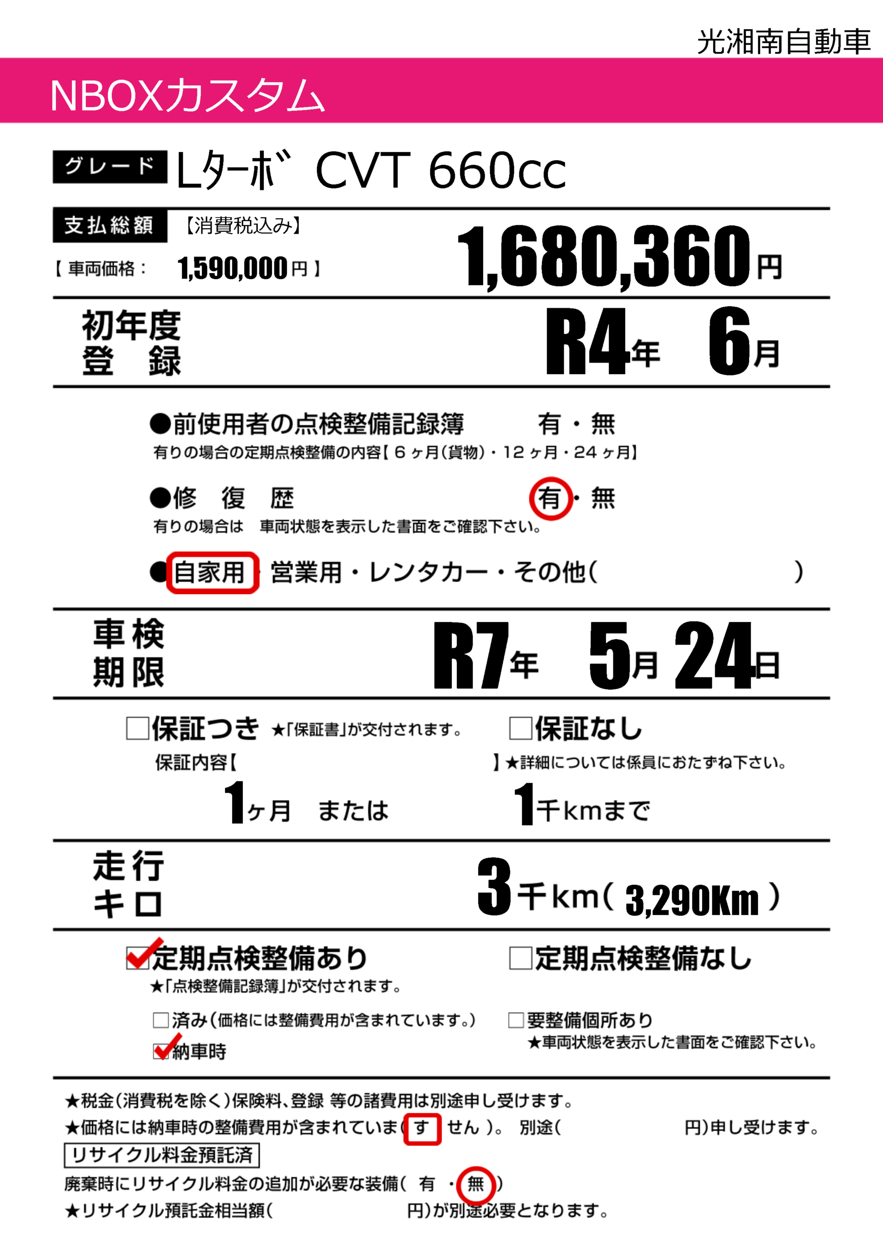 | 車名 | NBOXカスタム | グレード ミッション 排気量 |