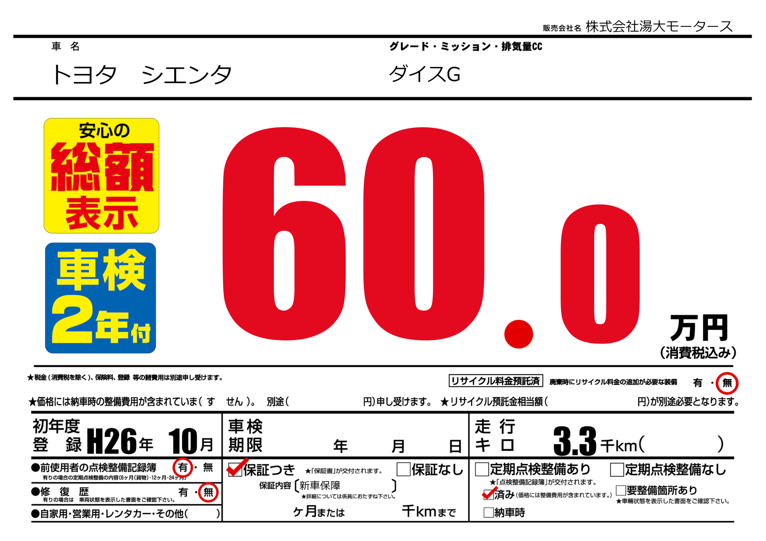 | 車名 | トヨタ シエンタ | グレード ミッション 排気量 |