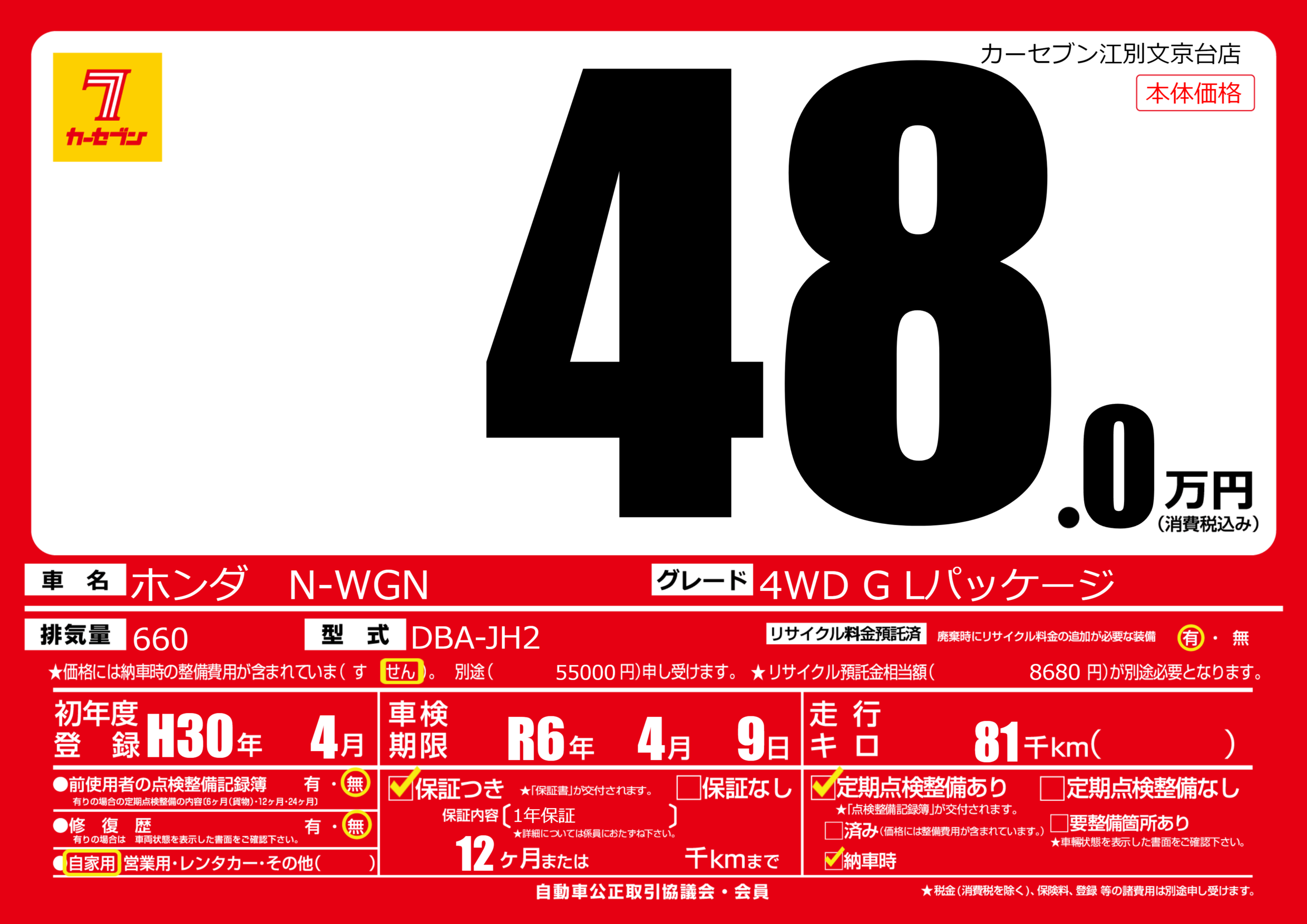 | 車名 | ホンダ N-WGN | グレード ミッション 排気量 |