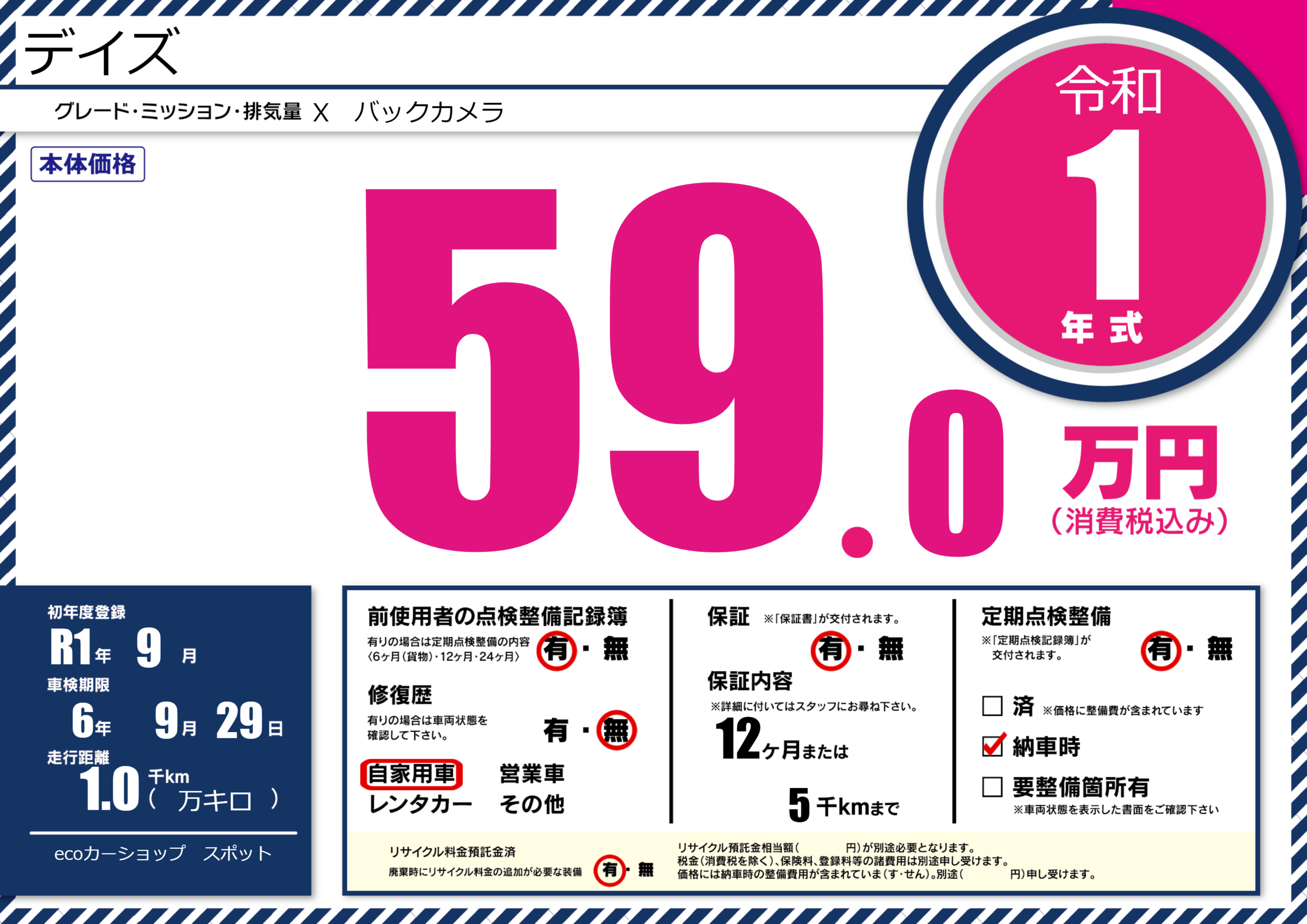 | 車名 | デイズ | グレード ミッション 排気量 |