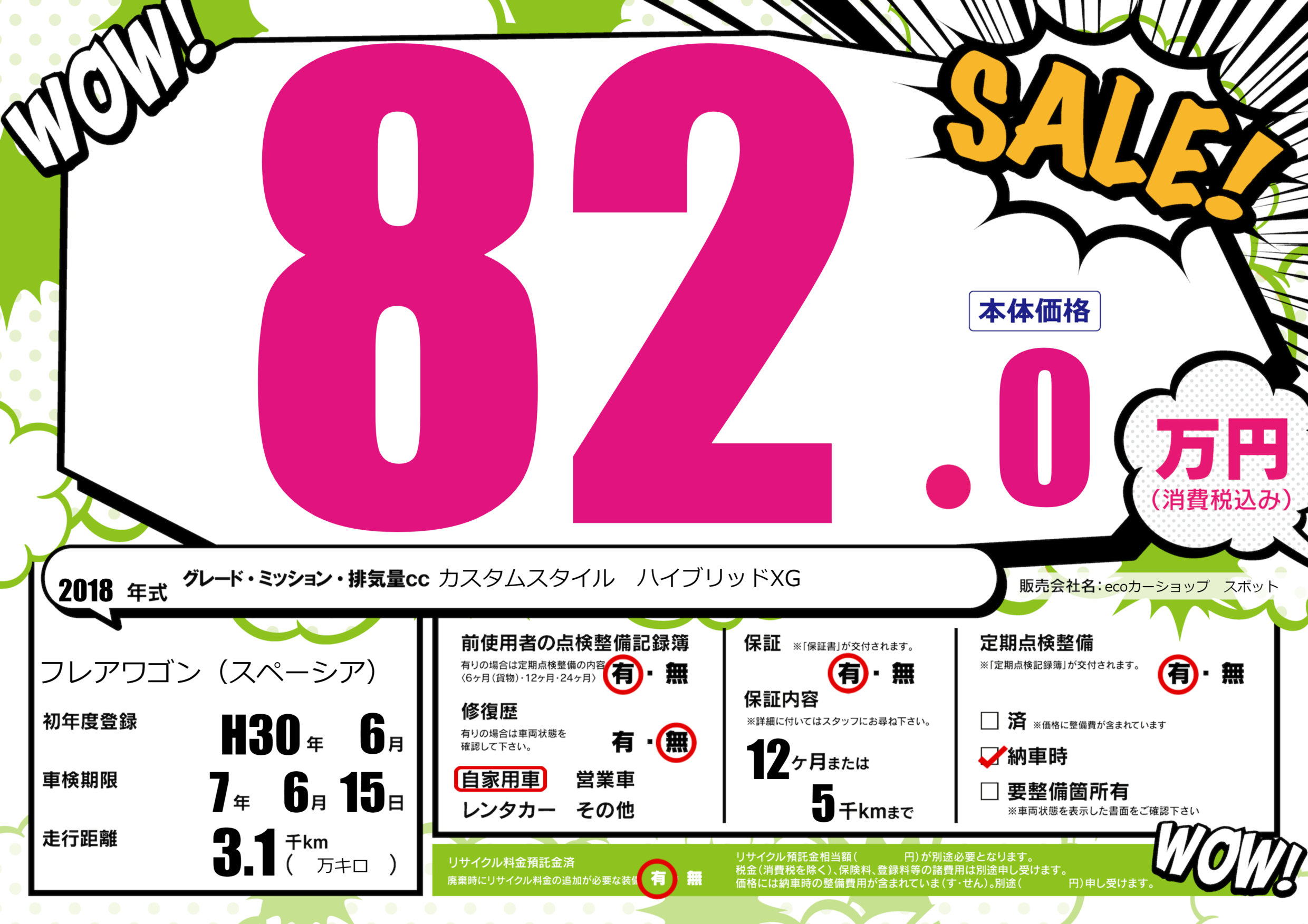 | 車名 | フレアワゴン(スペーシア) | グレード ミッション 排気量 |