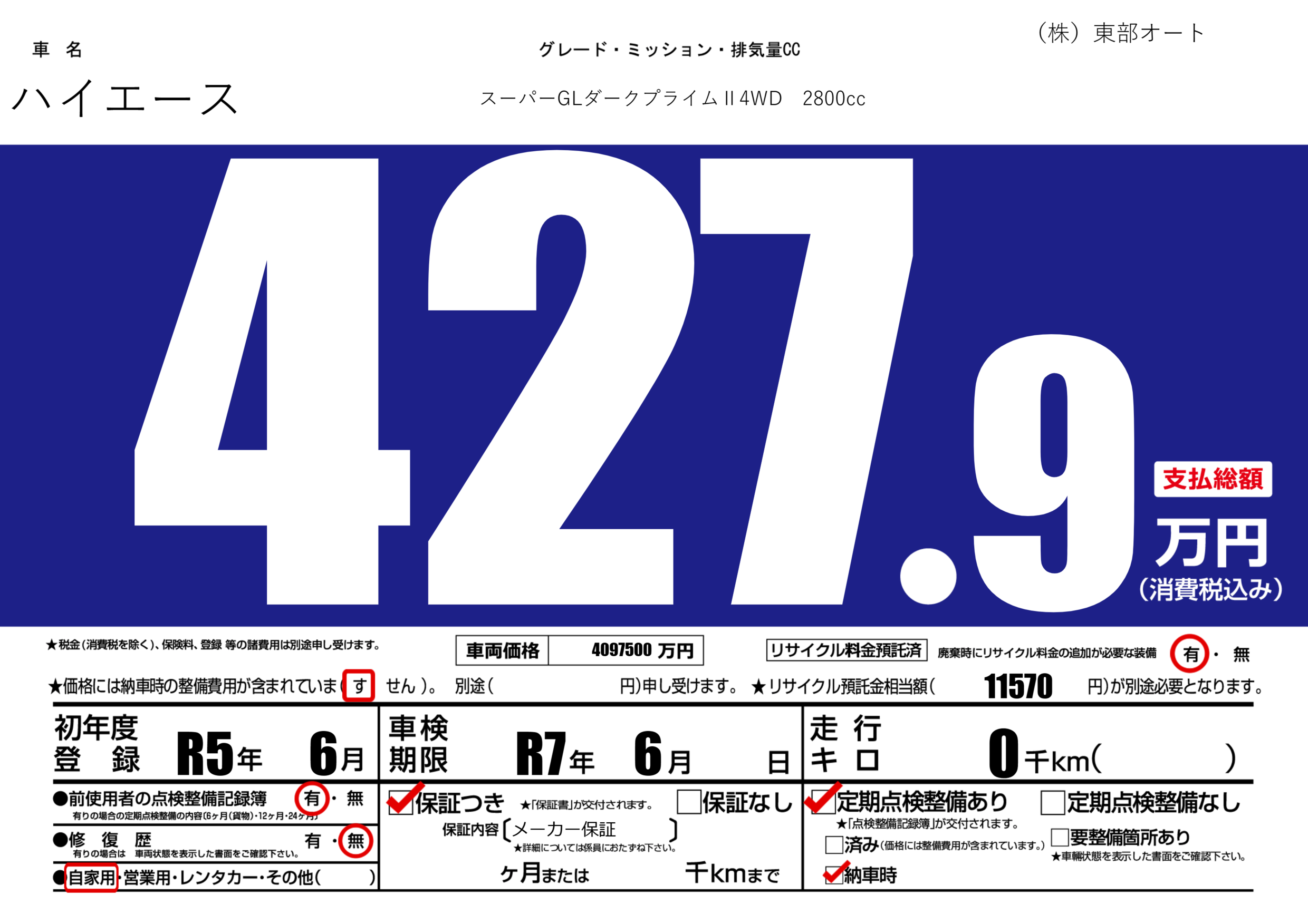 | 車名 | ハイエース | グレード ミッション 排気量 |