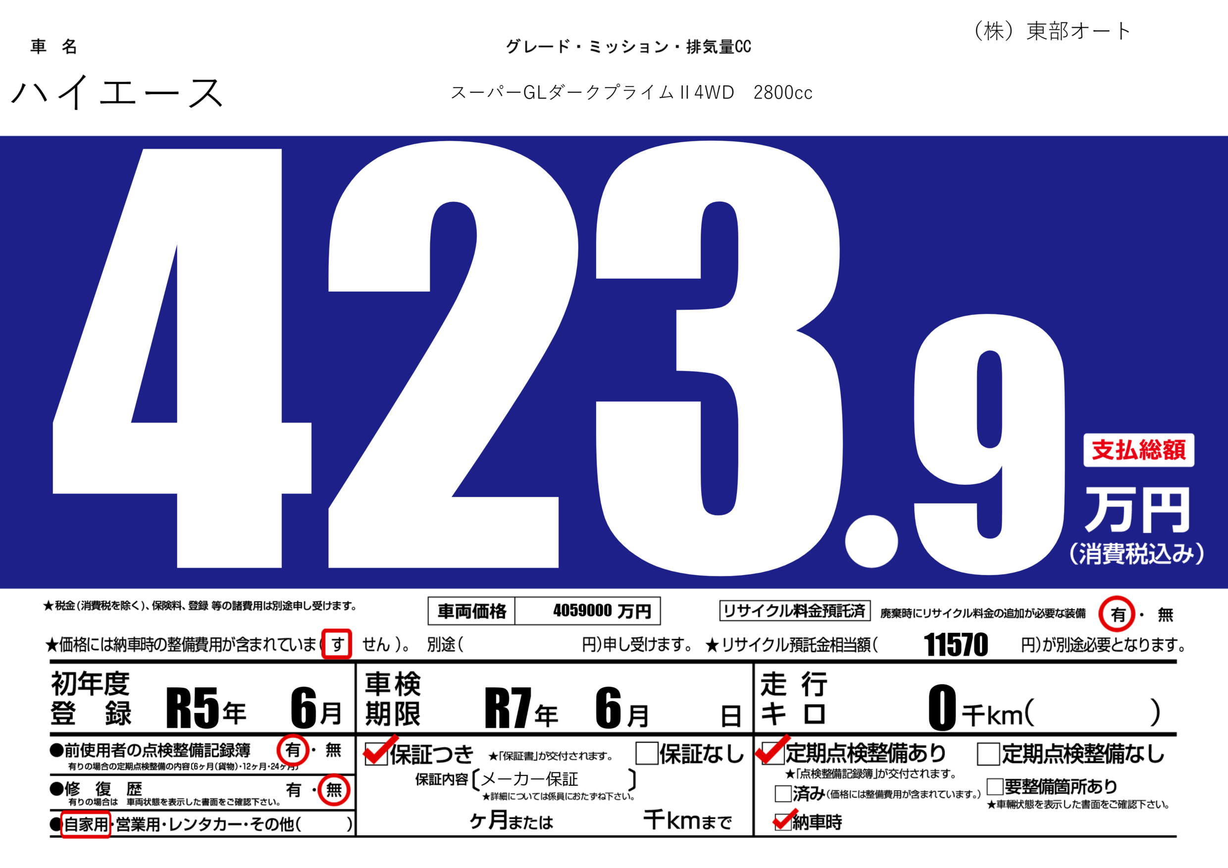 | 車名 | ハイエース | グレード ミッション 排気量 |
