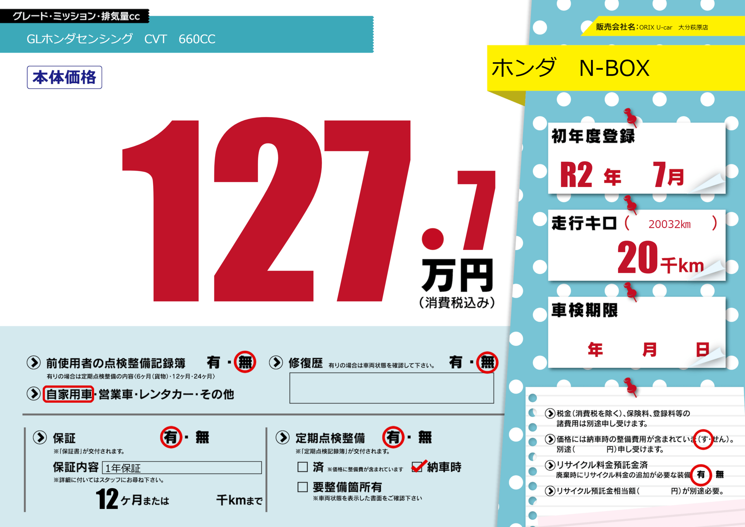 | 定期点検整備 | 定期点検整備あり 納車時あり | ||