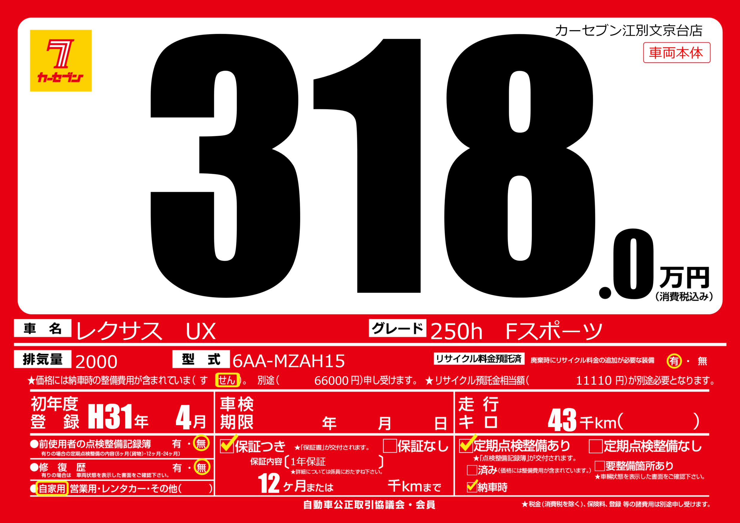 | 車名 | レクサス UX | グレード ミッション 排気量 |