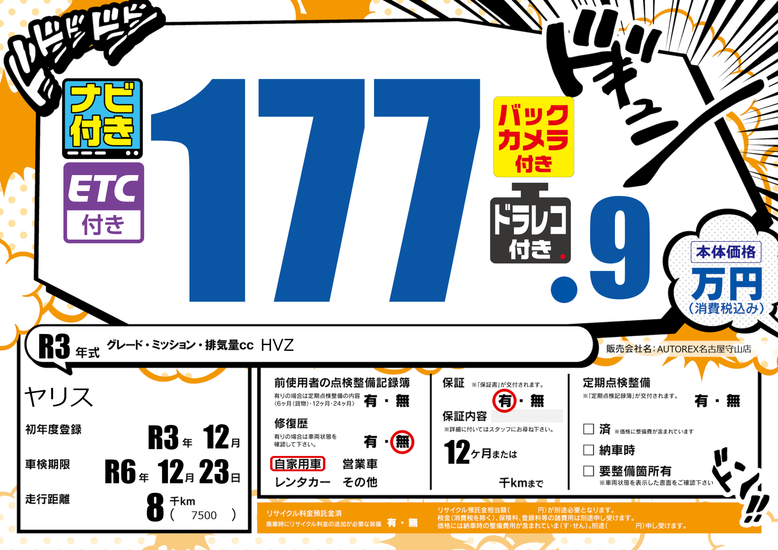 | 走行キロ | 0.8万km | 初年度登録 | R3年12月 |