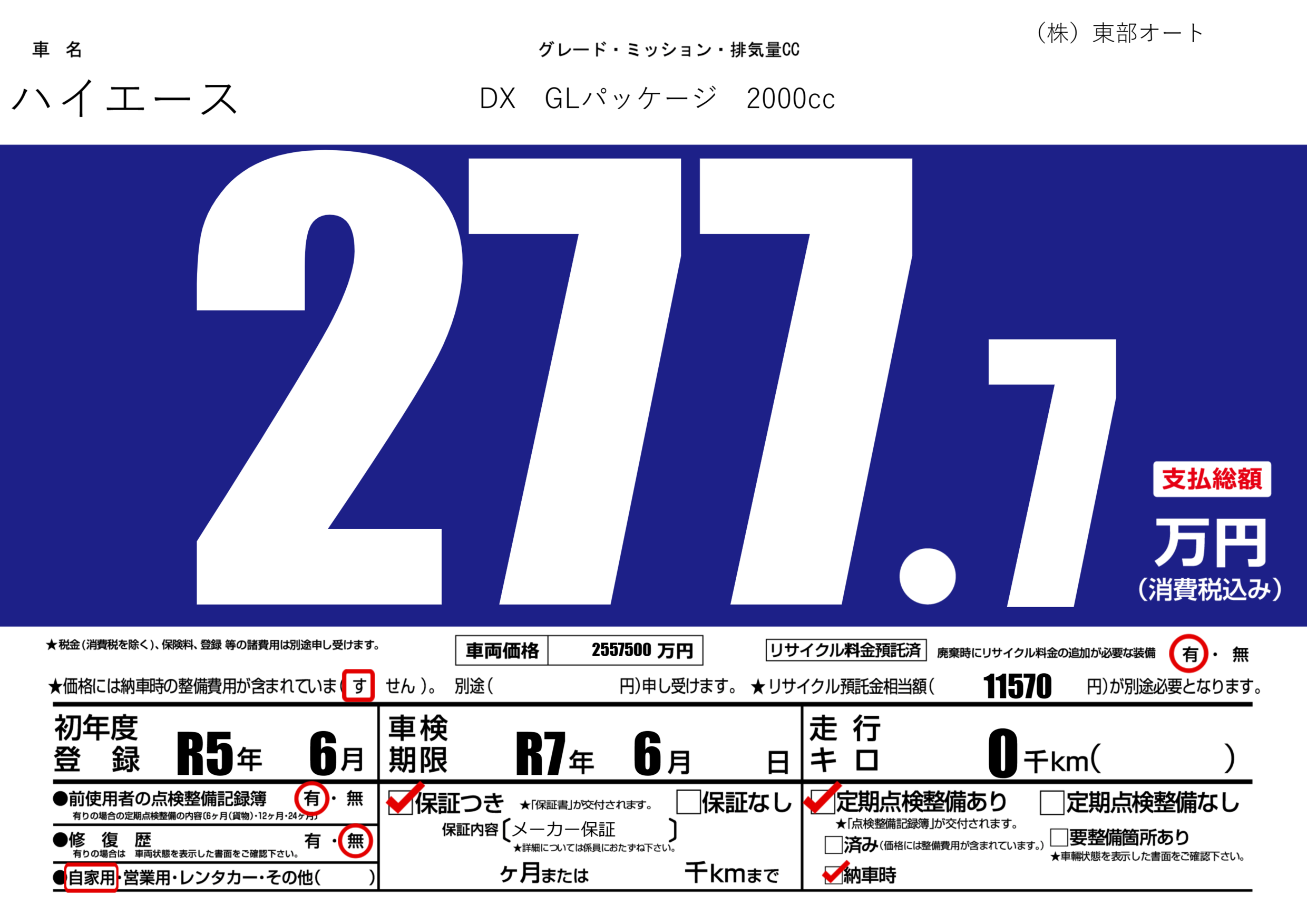 | 車名 | ハイエース | グレード ミッション 排気量 |