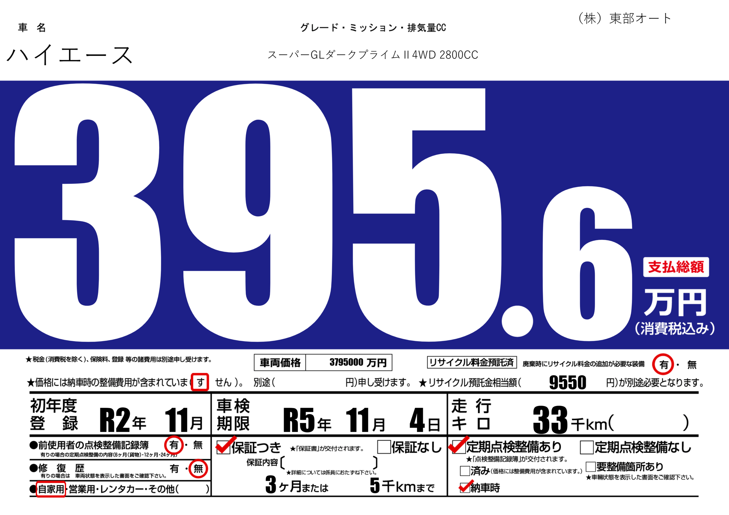 | 車名 | ハイエース | グレード ミッション 排気量 |