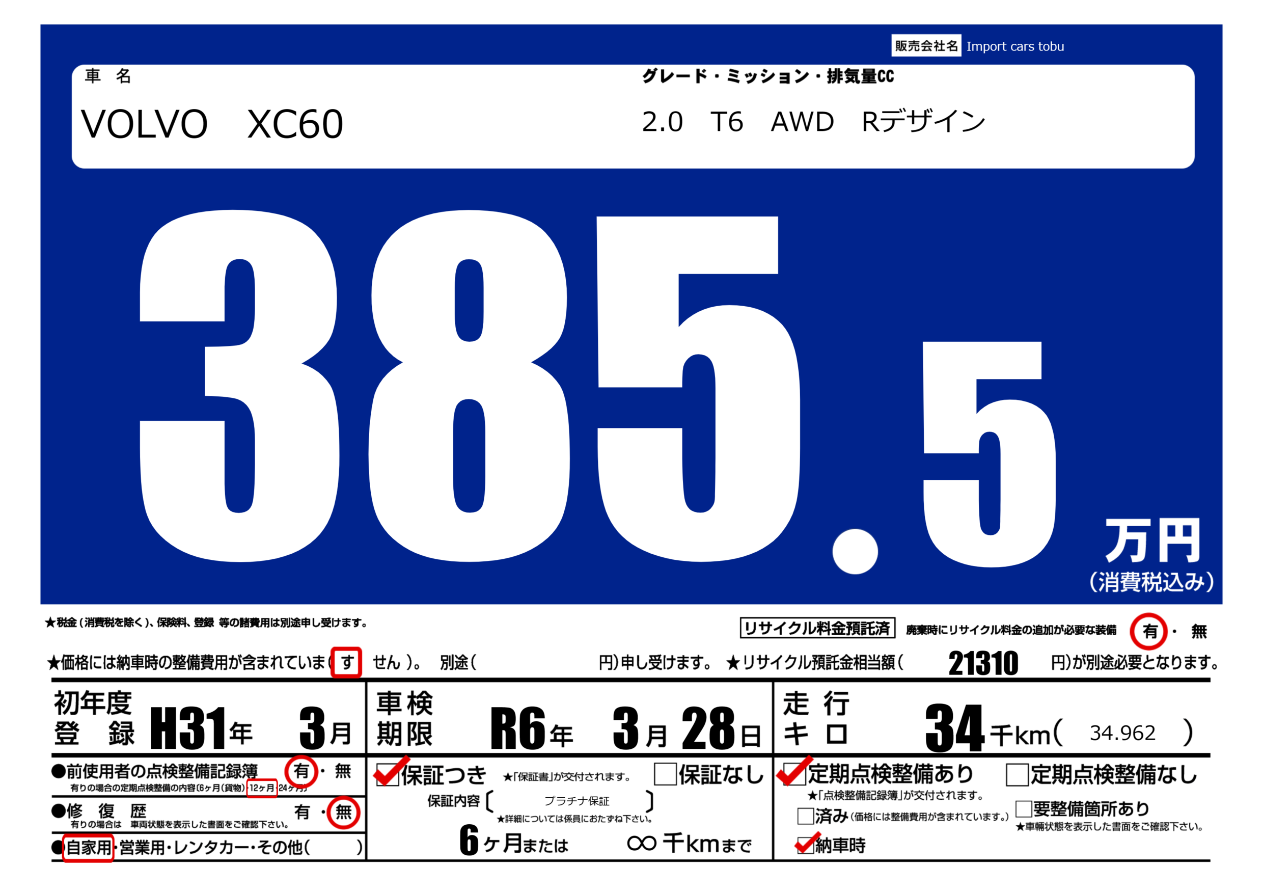 保証付き 保証内容( プラチナ保証) 6ヶ月または(∞)千kmまで |
