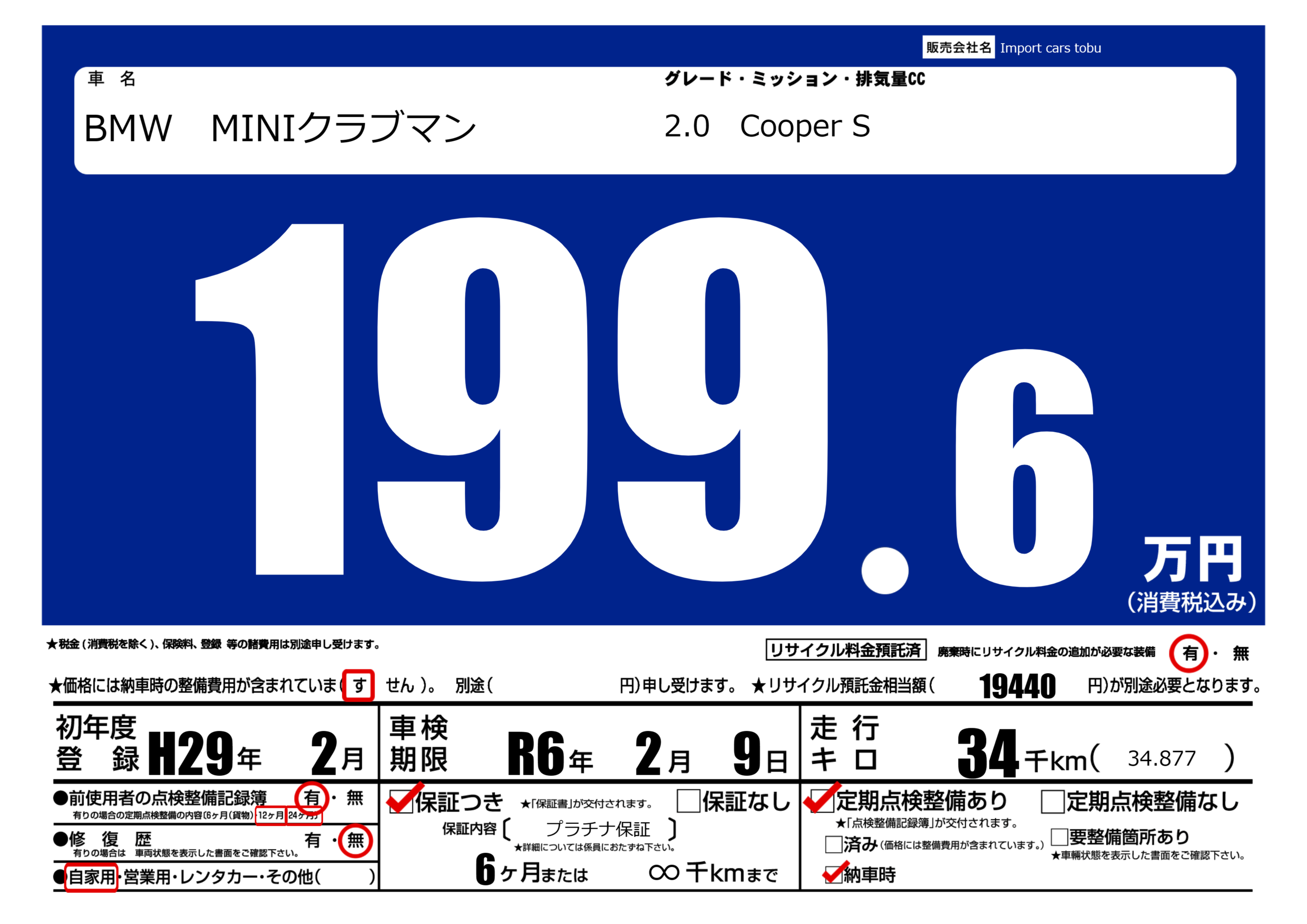 保証付き 保証内容( プラチナ保証) 6ヶ月または(∞)千kmまで |