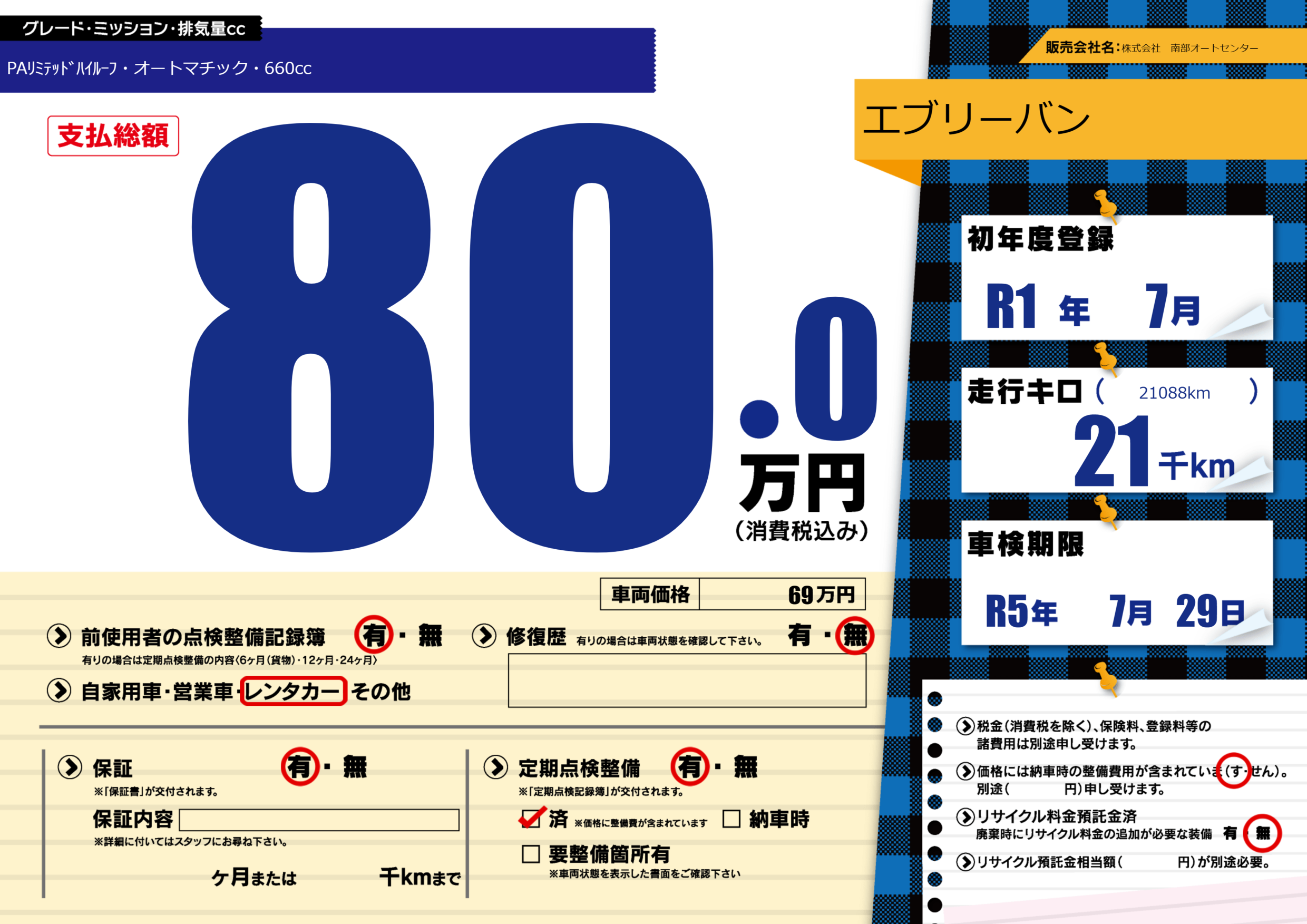 | 定期点検整備 | 定期点検整備あり 定期点検整備済み | ||