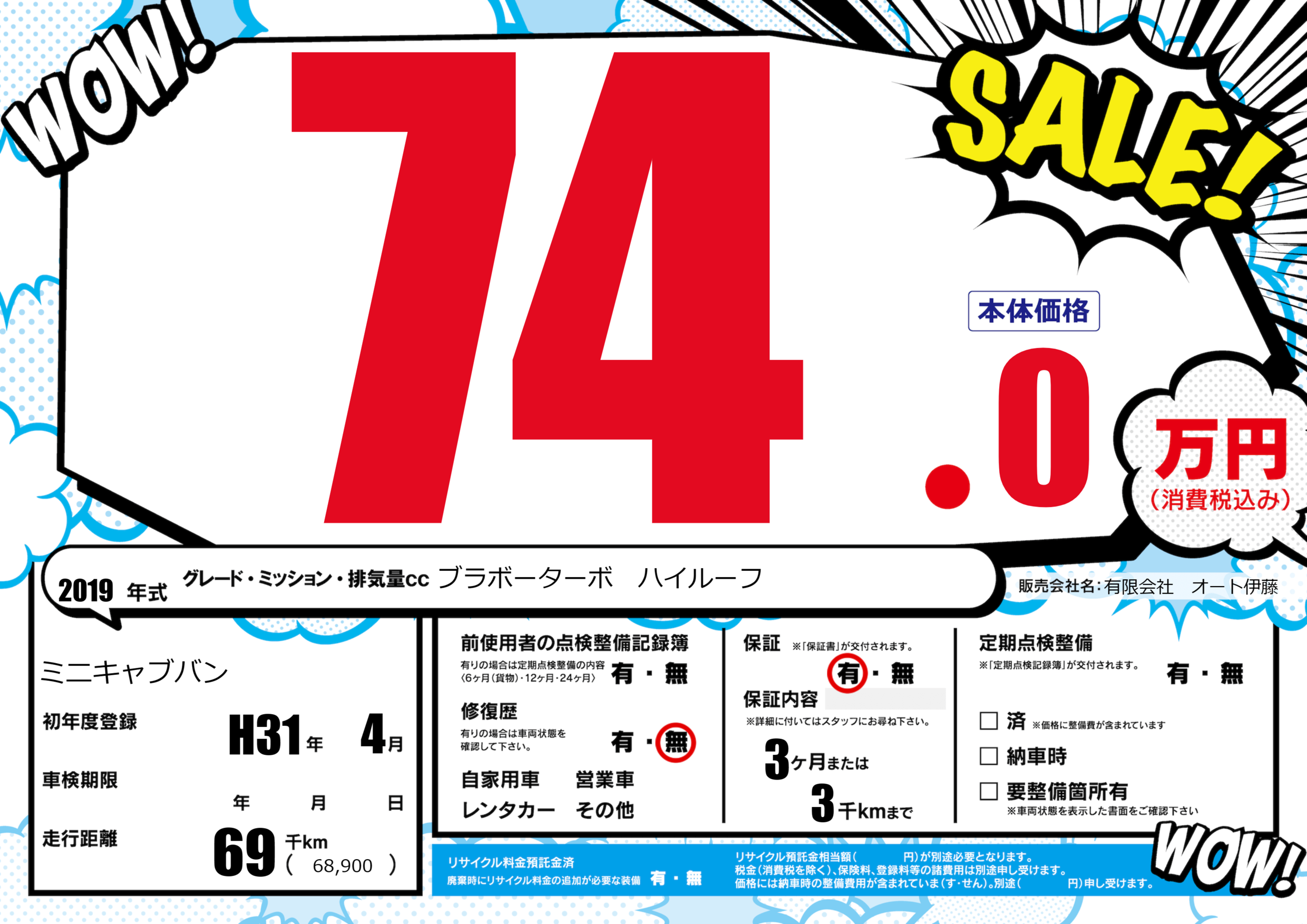 | 走行キロ | 6.9万km | 初年度登録 | H31年4月 |