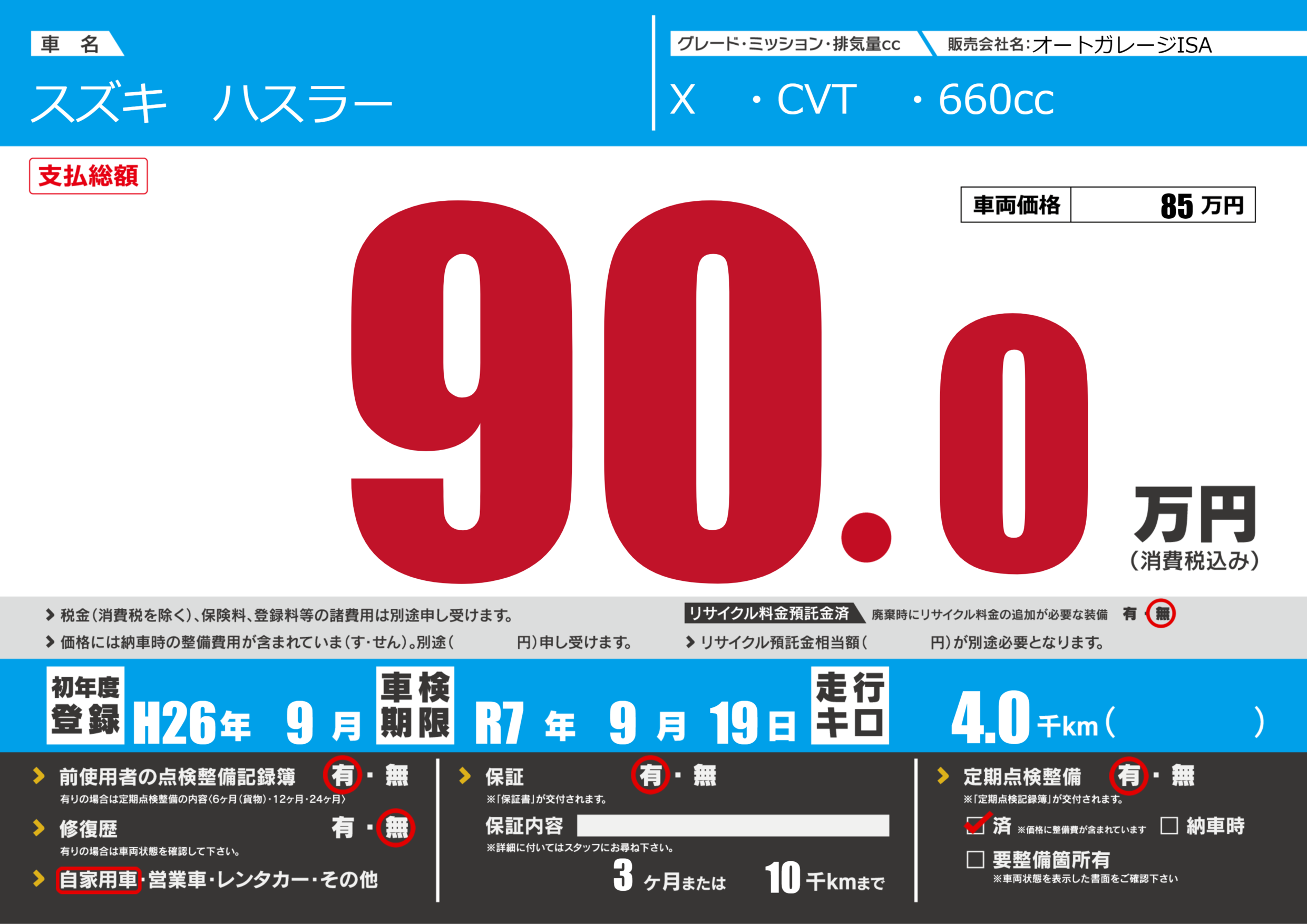 | 定期点検整備 | 定期点検整備あり 定期点検整備済み | ||