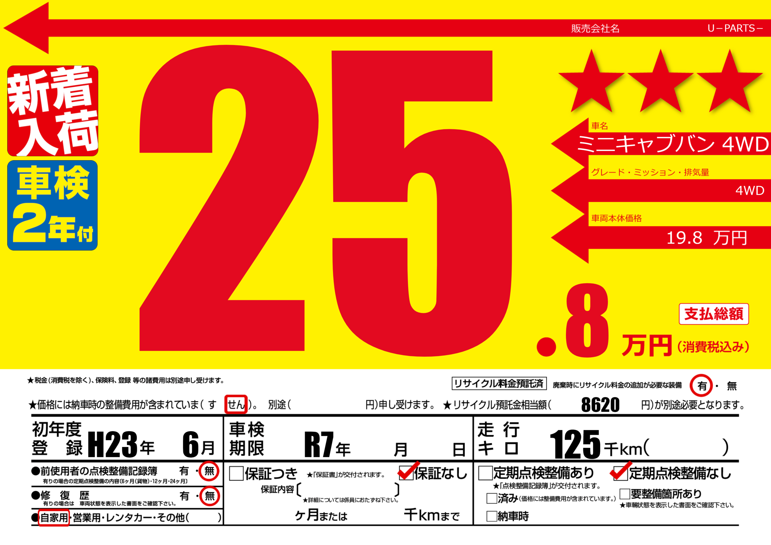 | 走行キロ | 12.5万km | 初年度登録 | H23年6月 |