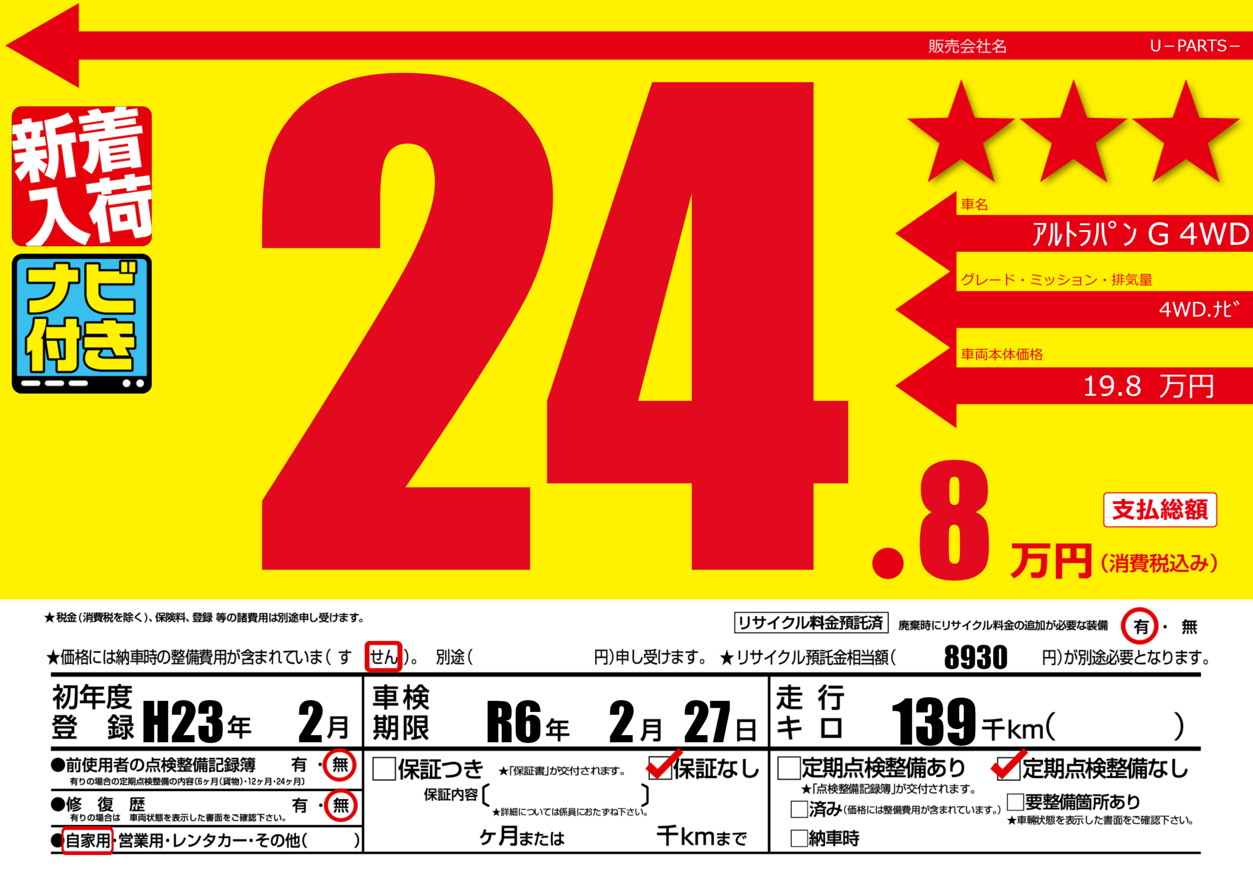 | 走行キロ | 13.9万km | 初年度登録 | H23年2月 |