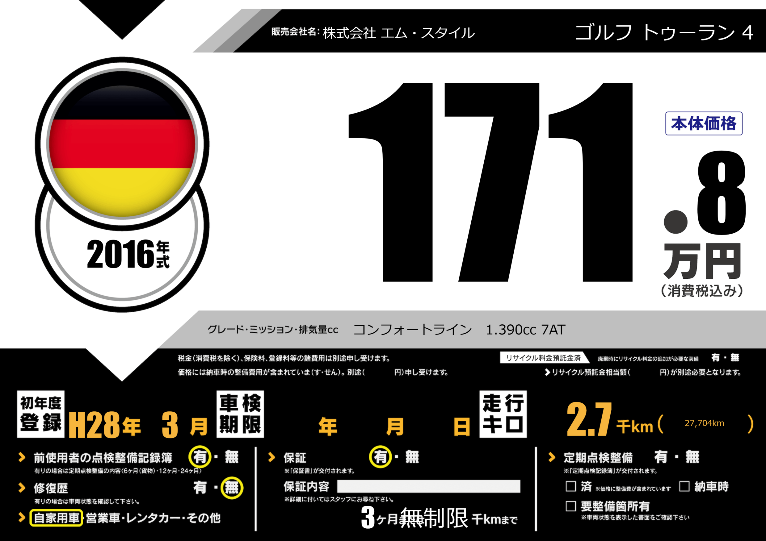 | 走行キロ | 0.2万km | 初年度登録 | H28年3月 |