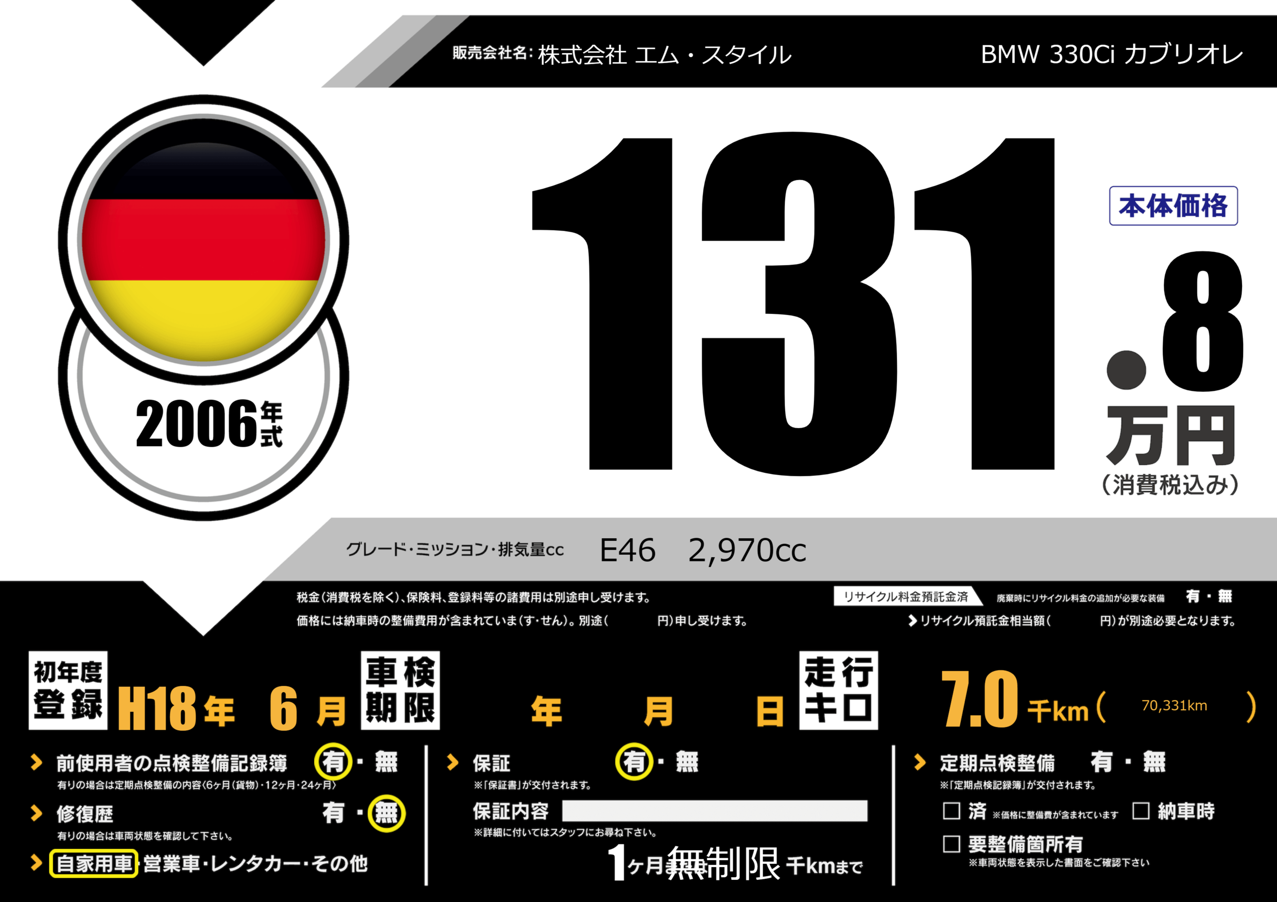 | 車名 | BMW 330Ci カブリオレ | グレード ミッション 排気量 |