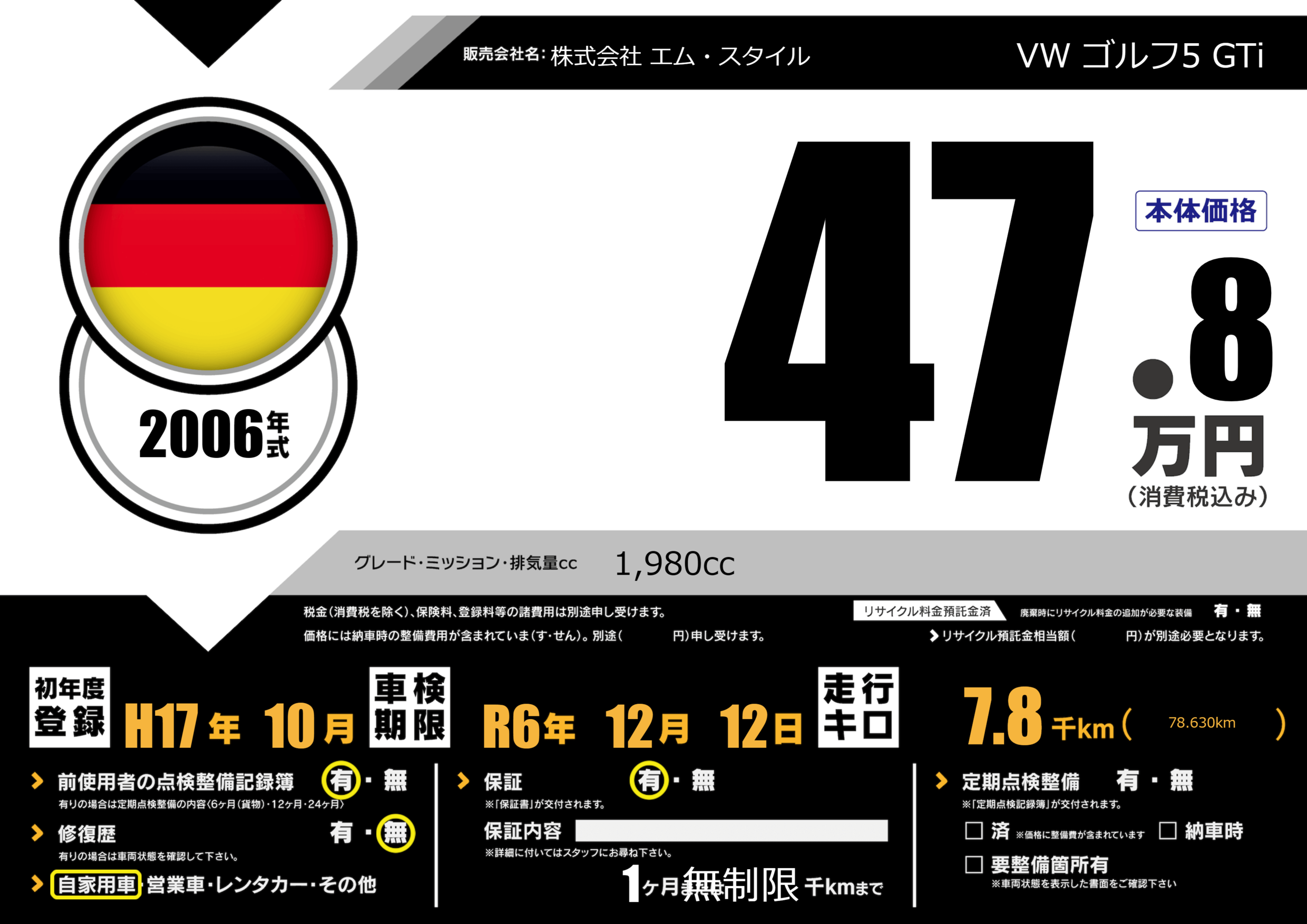 | 車名 | VW ゴルフ5 GTi | グレード ミッション 排気量 |